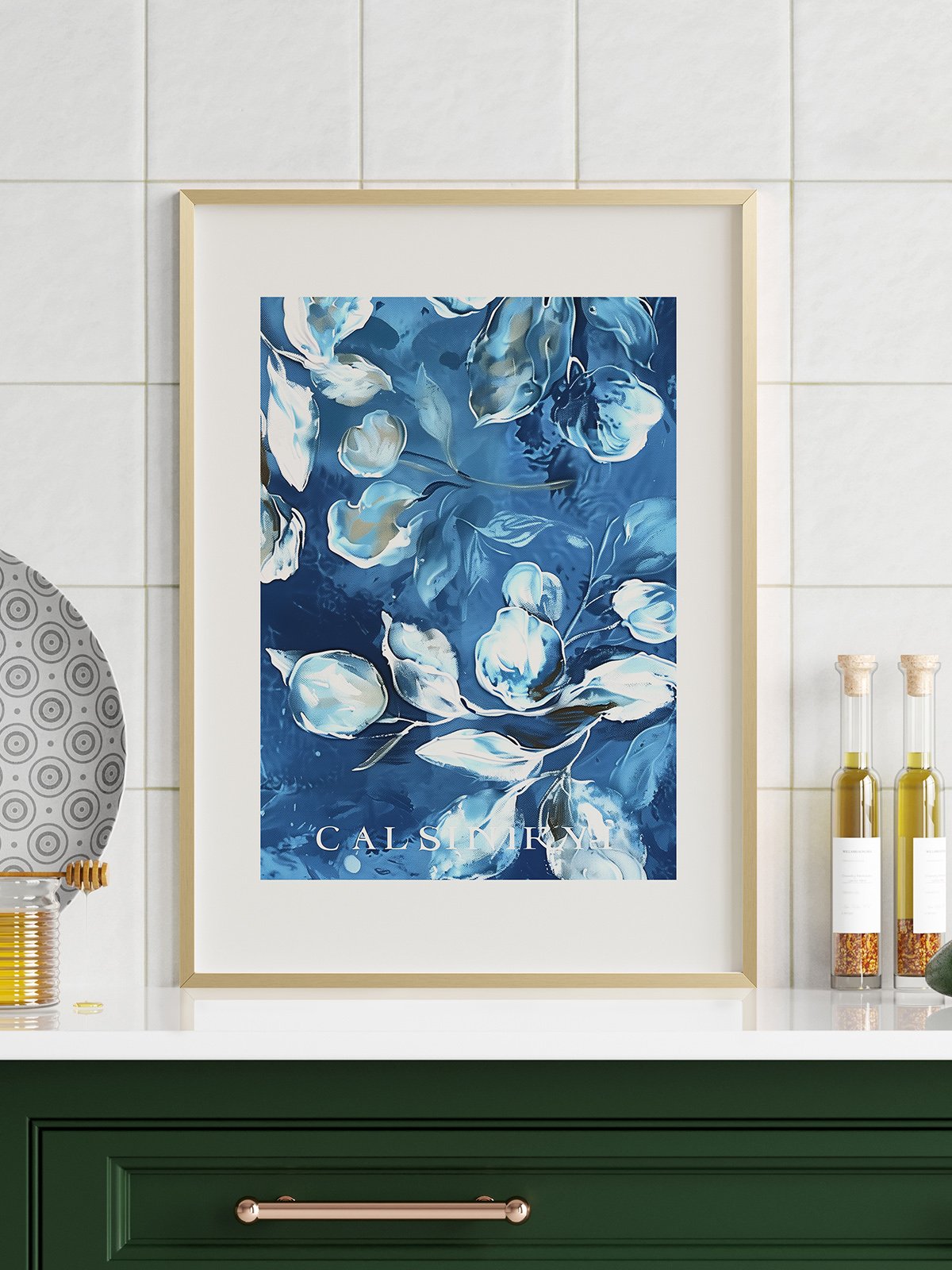 This painting has a deep blue background, creating a picture full of mystery and romance. Against the blue tone, the white flowers and leaves are particularly eye-catching. They are like dancing elves, light and agile. The whole painting is filled with fantasy and romance.