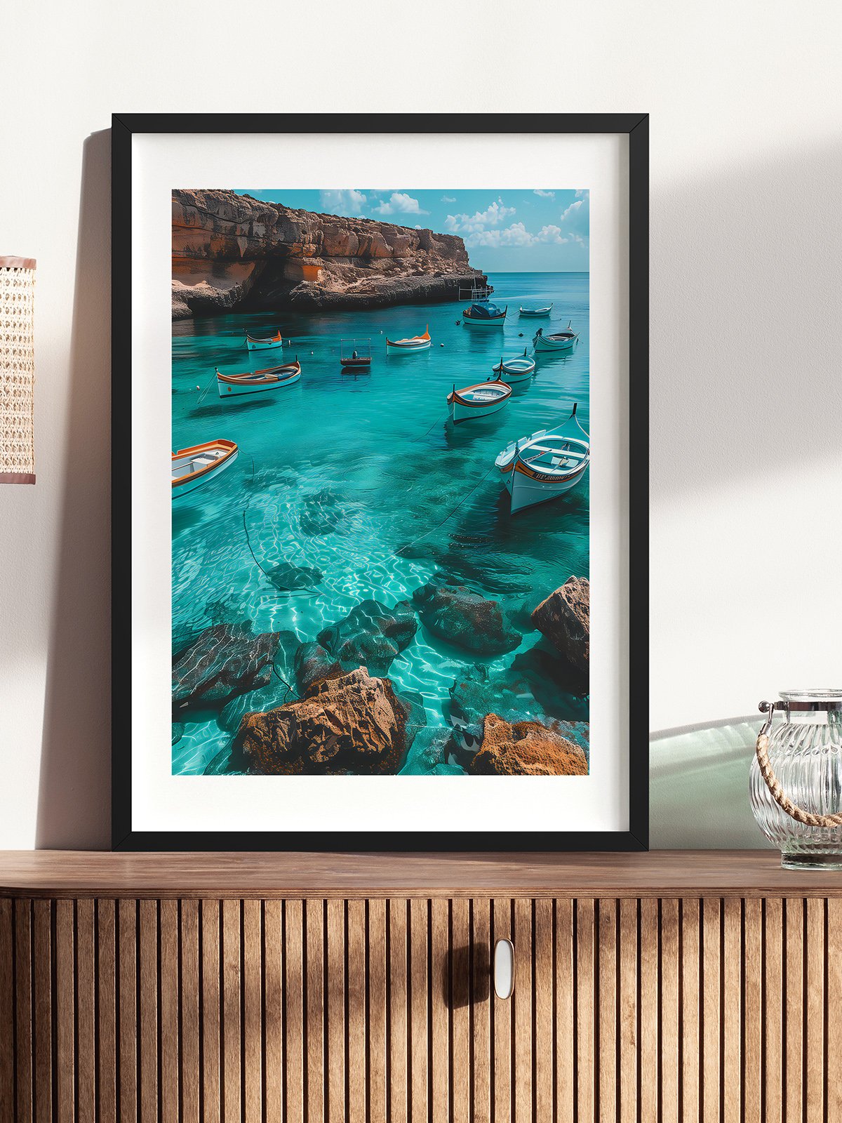 The crystal-clear blue water reveals the rocks beneath and the reflections of colorful boats floating gently on the surface. The rocky cliffs along the coast are bathed in sunlight, enhancing their grandeur. The white clouds in the sky contrast beautifully with the blue of the sea, creating a serene and stunning scene that seems to freeze time in its beauty.