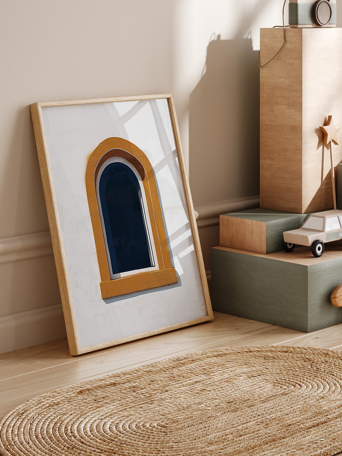This photograph features a window with a yellow frame, set against a snow-white wall, with a deep blue interior. The simple color combination makes the image appear bright and clean, while the contrast between yellow and blue is both striking and harmonious. The arched design of the window adds a touch of softness to the scene. The entire piece evokes a sense of freshness and joy, as if narrating a story of light and hope.