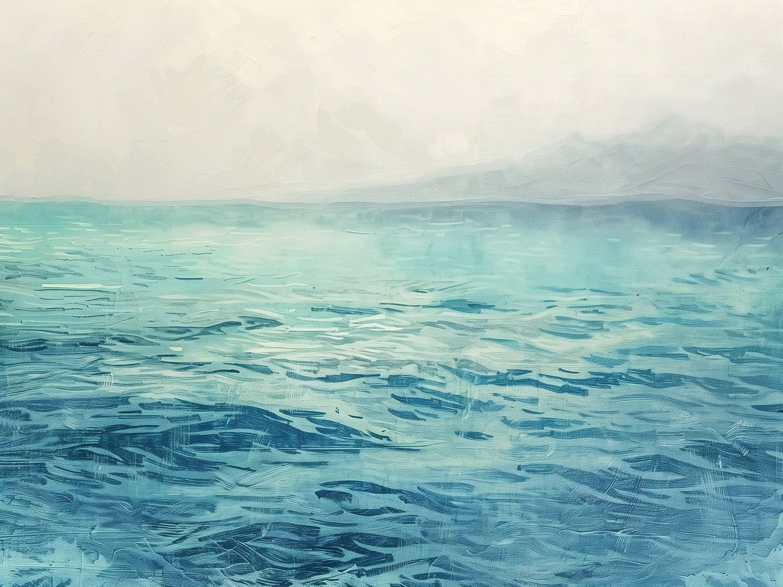 This painting captures a serene ocean, with the water displaying layers of blue and green hues, gently rippling in the breeze. The distant horizon blends seamlessly with the sky, creating a sense of tranquility and vastness. The delicate and soft colors and brushstrokes make one feel as if they are immersed in a quiet, expansive ocean world, experiencing a profound sense of calm and freedom.