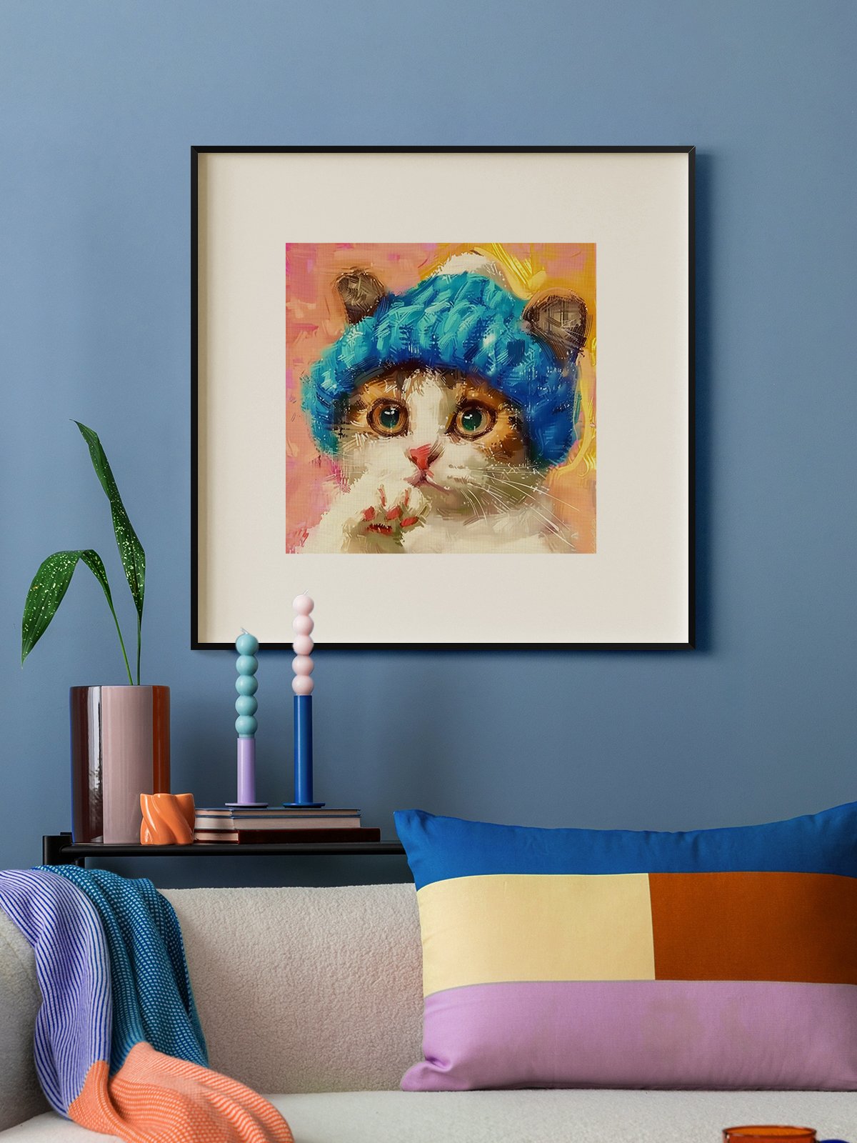 In this painting, a kitten wears a blue knitted hat, its eyes gentle and adorable. The colorful background exudes warmth. Through soft brushstrokes and rich colors, the artwork creates a cozy and comforting atmosphere, evoking feelings of warmth and care in the winter season.