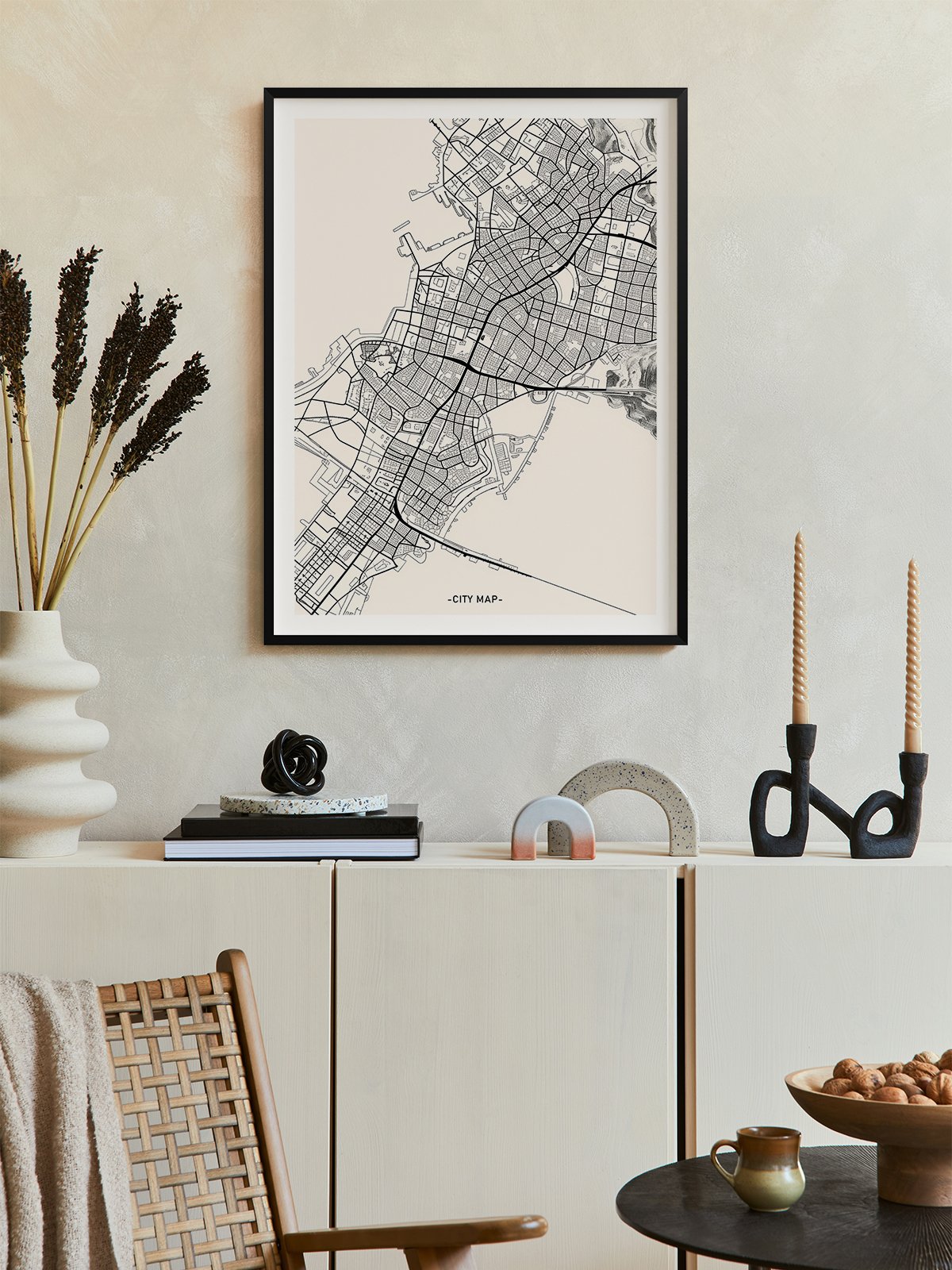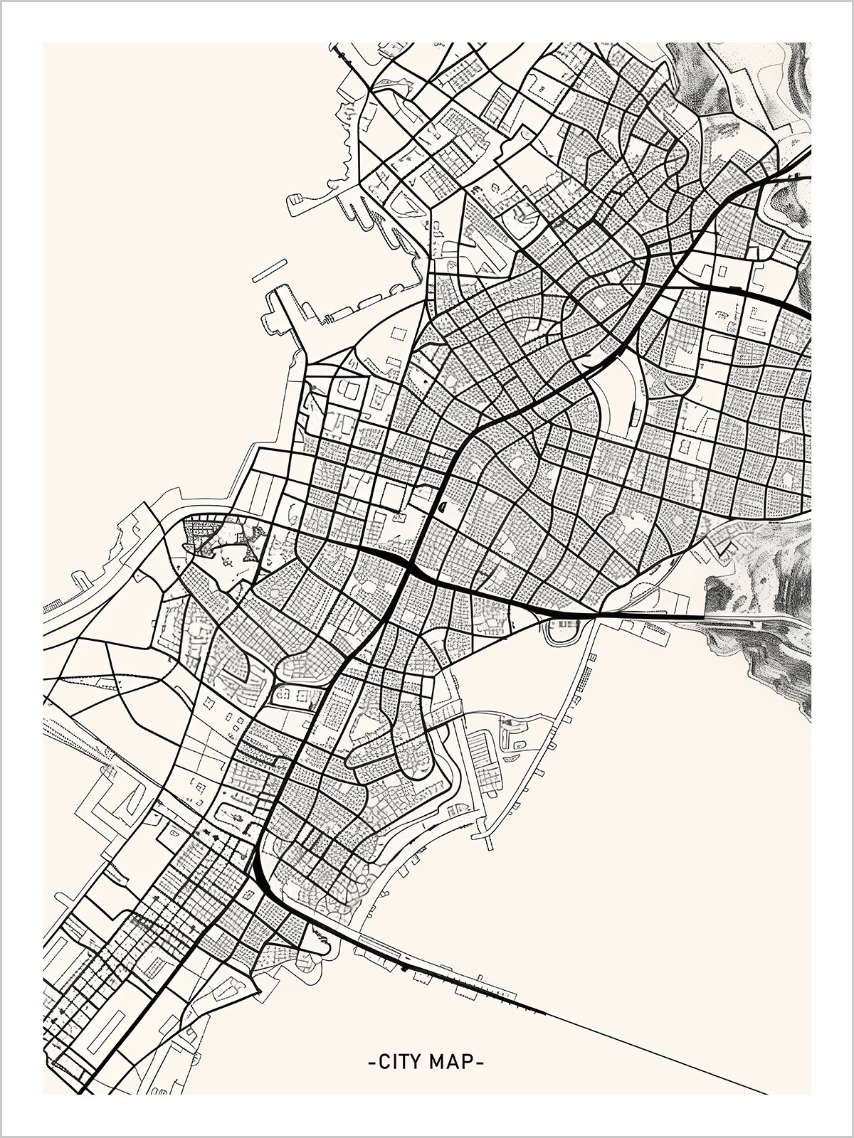 This image shows a detailed city map, clearly depicting the layout of streets and districts. The black lines outline the city’s road network, presenting a simple yet refined aesthetic, as if revealing the city’s pulse and vitality.