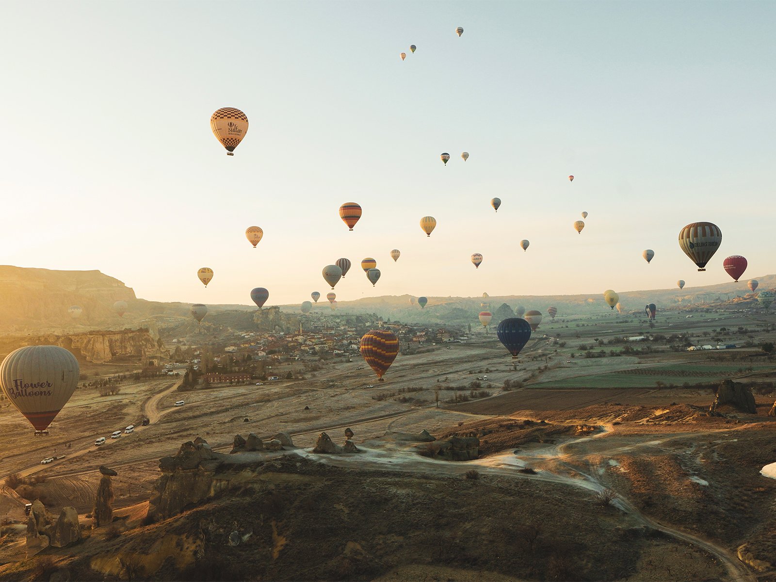This image captures the stunning sight of countless hot air balloons ascending in the morning light, filling the sky with vibrant colors. Below lies a peaceful town and vast fields. The scene is full of energy and romance, as if stepping into a dream-filled fantasy world.