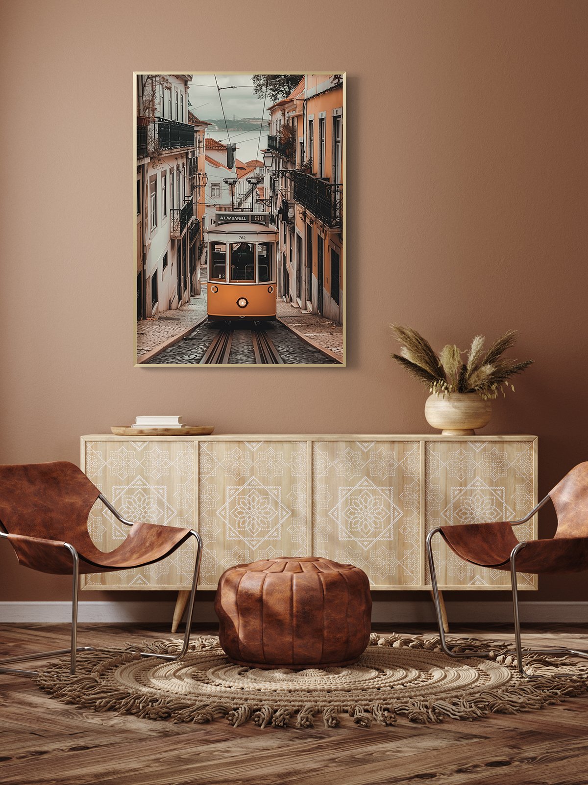 This photo shows a yellow tram running through the narrow streets of Lisbon, flanked by traditional Portuguese buildings, with the sea faintly visible in the background. The photo evokes a sense of nostalgia and vibrant energy, capturing the unique cultural atmosphere of the city.