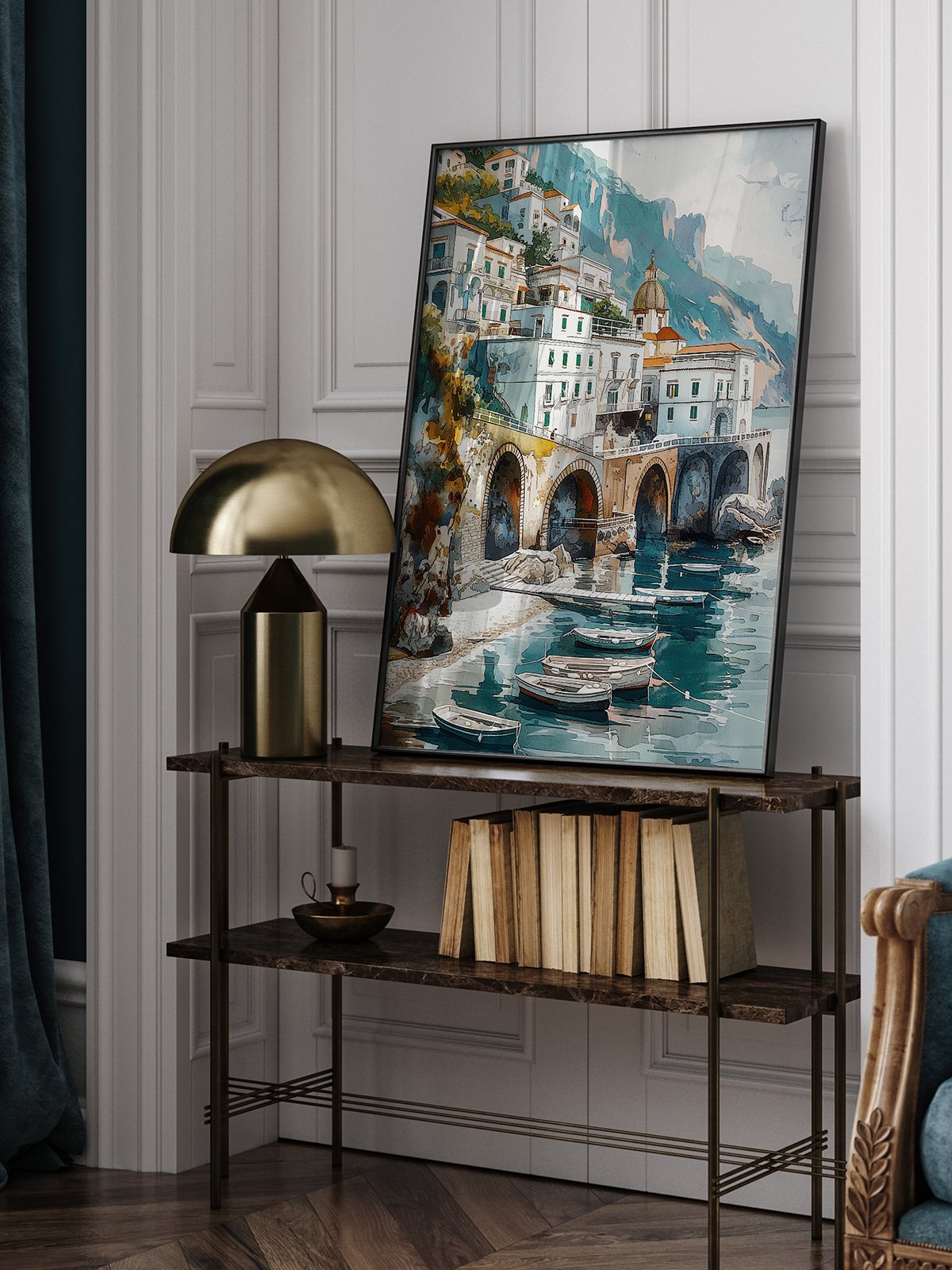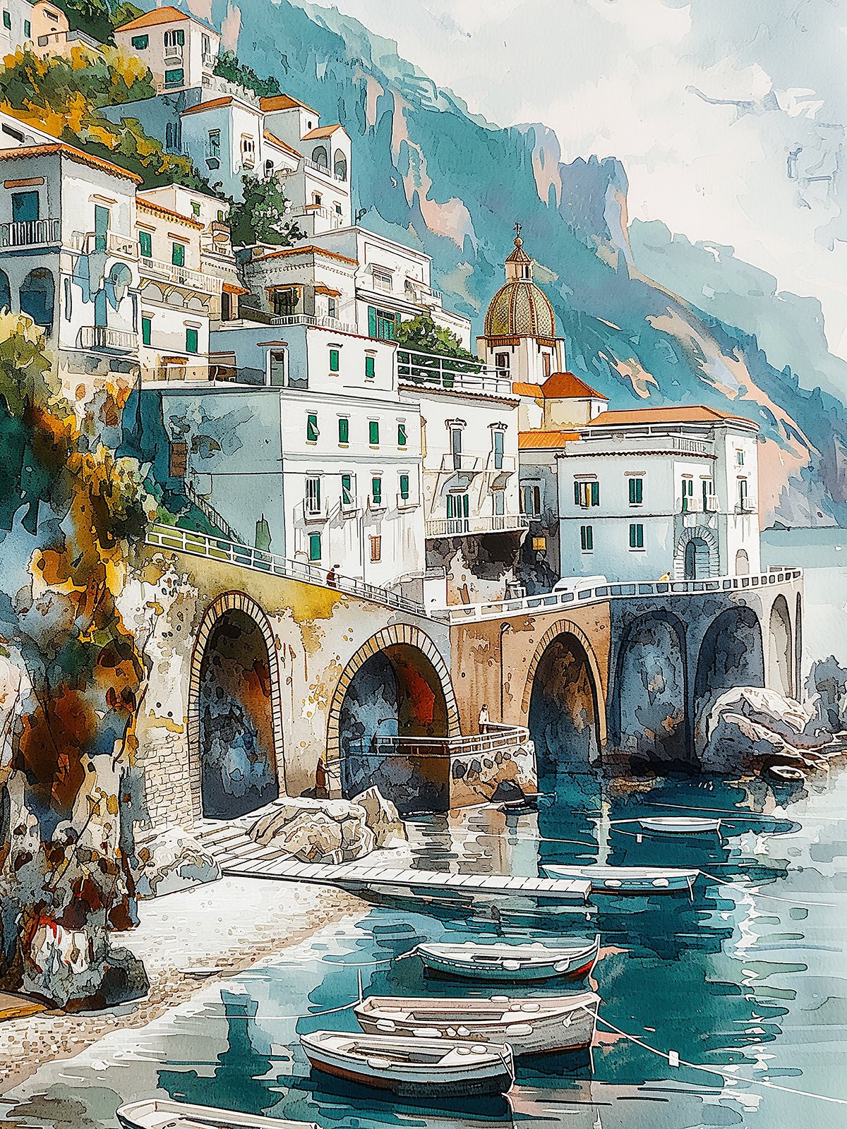 White buildings with orange-red roofs dot the coastal hillside, harmonizing with the clear blue sky and the deep blue sea. A stone bridge spans the water, small boats float quietly, and distant mountains are shrouded in mist, creating a scene of tranquil coastal beauty.