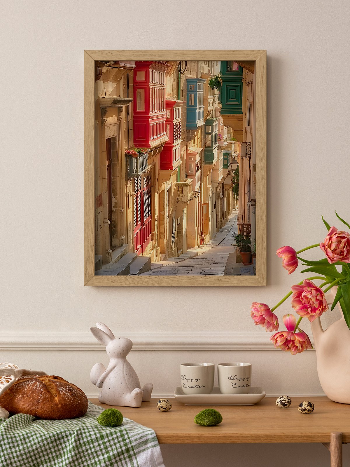This photo shows an alleyway full of color and life. The sunlight shines on the colorful windows and door frames, warm and vivid. The red, blue and green windows are staggered, showing the unique style of the Mediterranean city. The whole alley is full of historical charm and peaceful atmosphere, which is very pleasant.