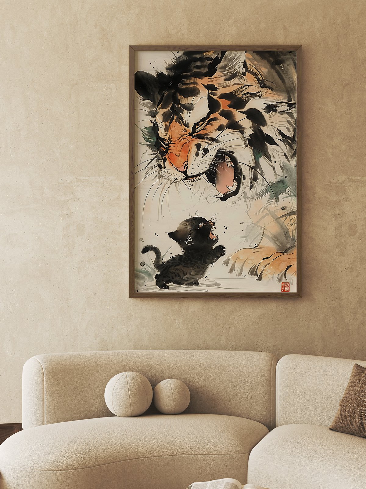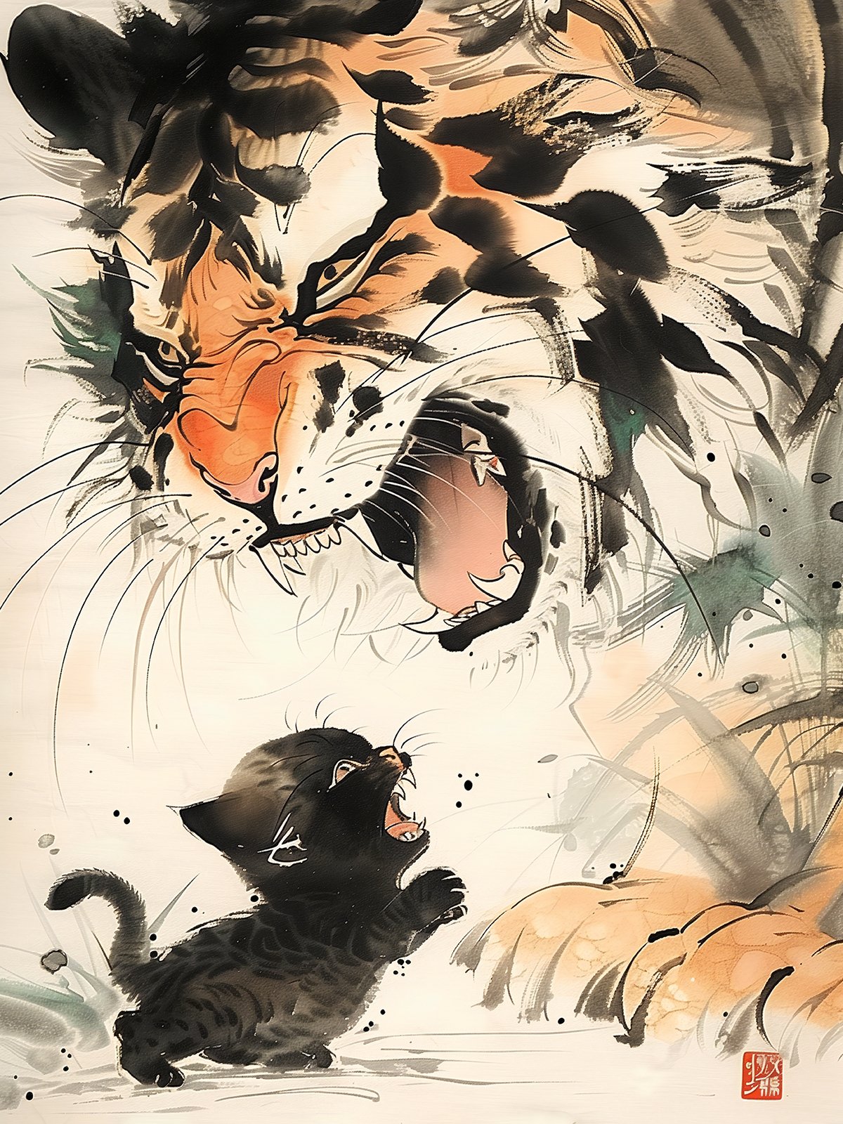 In this artwork, a tiny kitten bravely faces a roaring tiger. Despite the vast difference in size, the kitten stands fearlessly, responding with courage. The exaggerated contrast and vivid strokes convey the power of fearlessness and bravery, evoking the spirit of facing even the greatest challenges with courage.