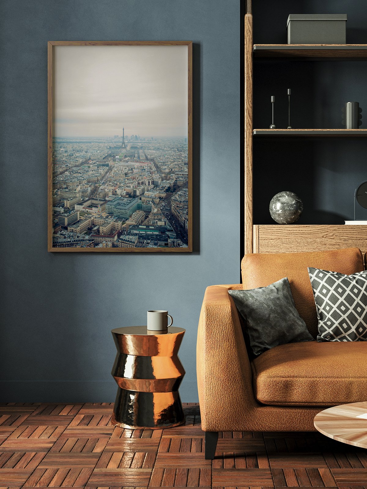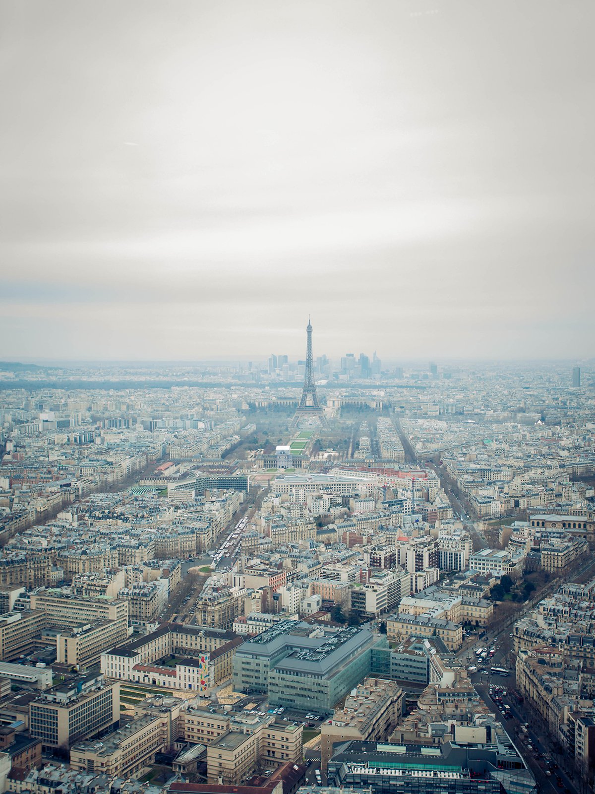 This image captures a stunning aerial view of Paris, with the Eiffel Tower standing tall in the center, like a guardian of the city. The modern buildings in the background contrast with the classical tower, creating a profound impression of the blend between history and modernity.