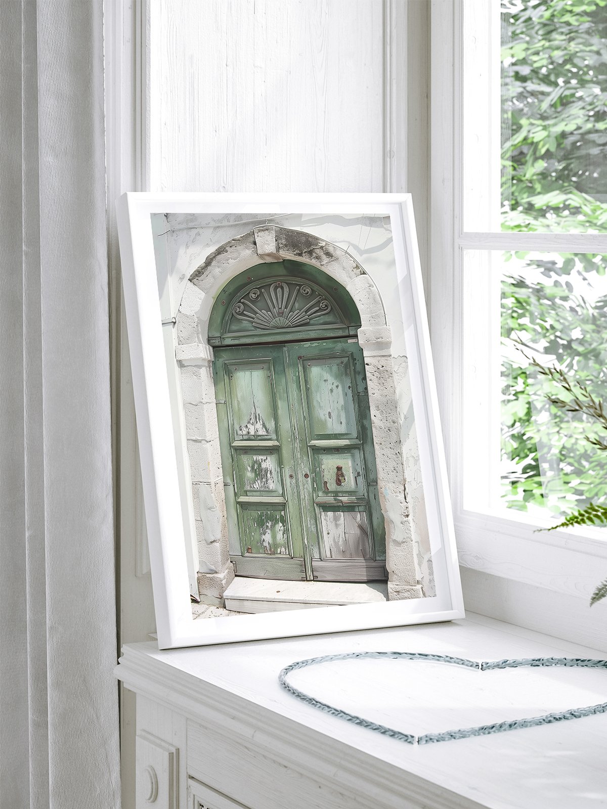 «This photograph showcases an old green door, weathered and worn, with peeling paint and wood that reveal the passage of time. The intricate carvings above the door frame still hint at past splendor. The rough stone walls on either side add a sense of rustic solidity. This door seems to guard countless stories and memories, allowing one to feel the weight of history and the passage of years. This ancient beauty evokes a sense of nostalgia for bygone days and reverence for history.