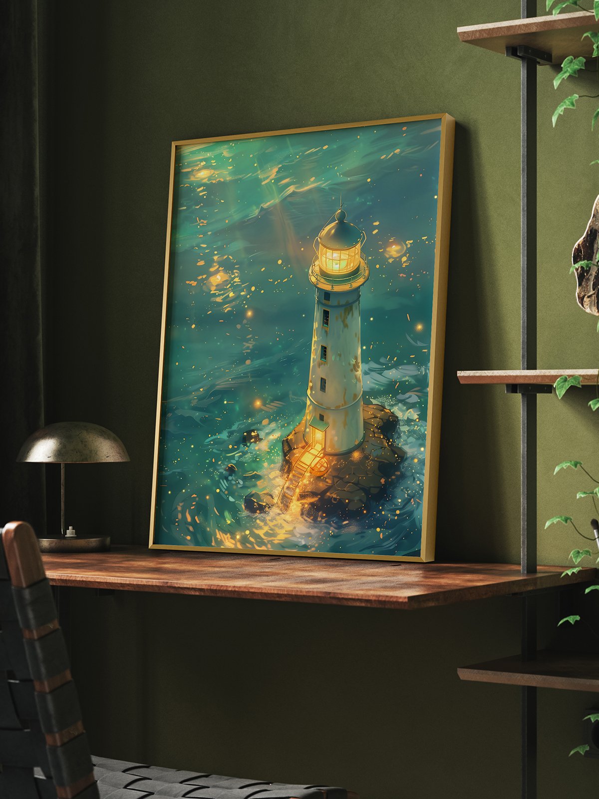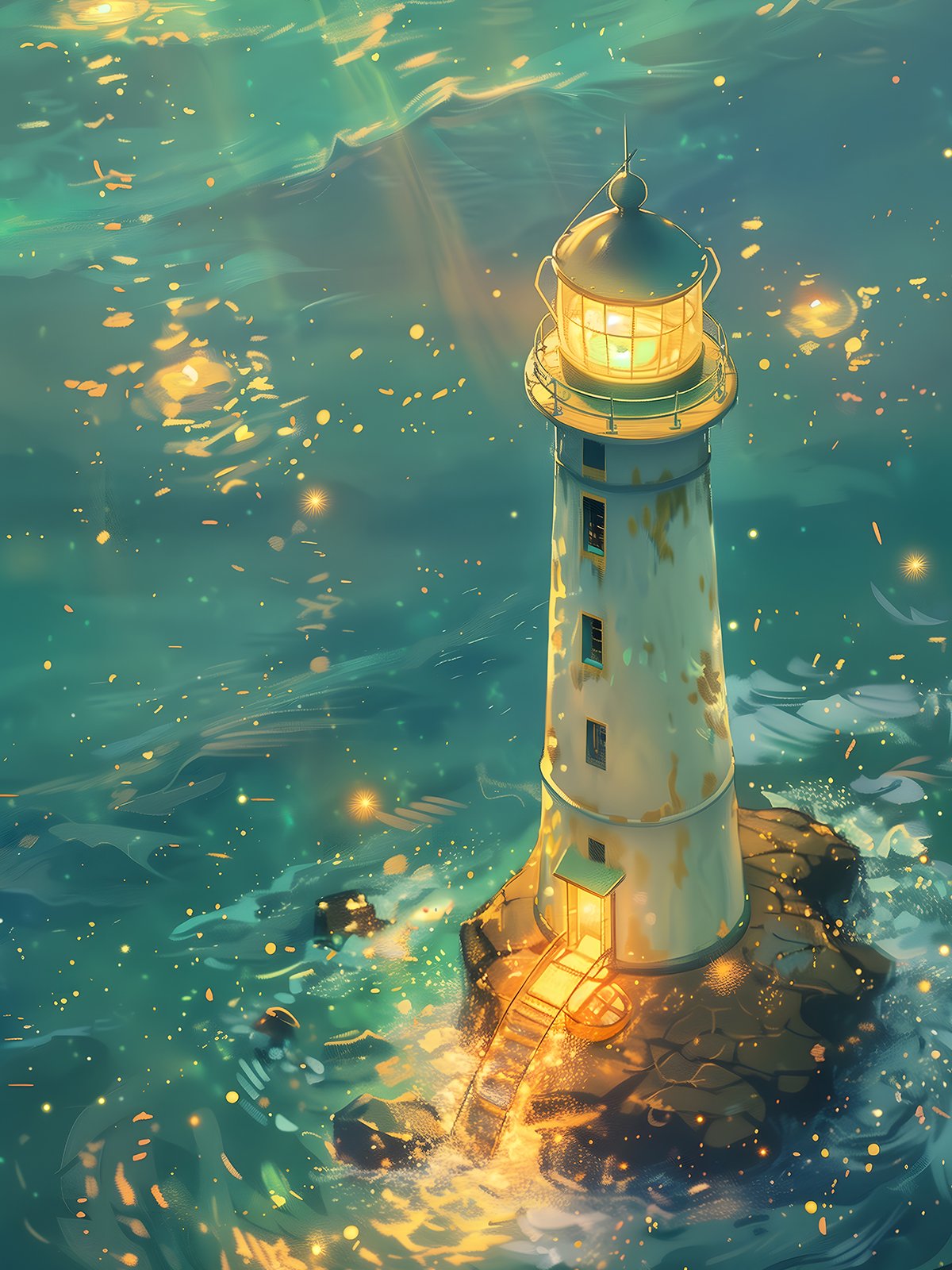 This painting depicts a solitary lighthouse surrounded by a sea adorned with starlight, its beacon shining through the shimmering water, creating a dreamlike atmosphere. The scene is filled with tranquility and mystery, evoking a sense of hope and guidance, as if directing lost sailors through the endless night sea.