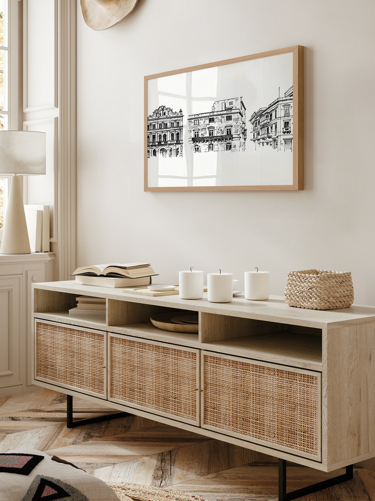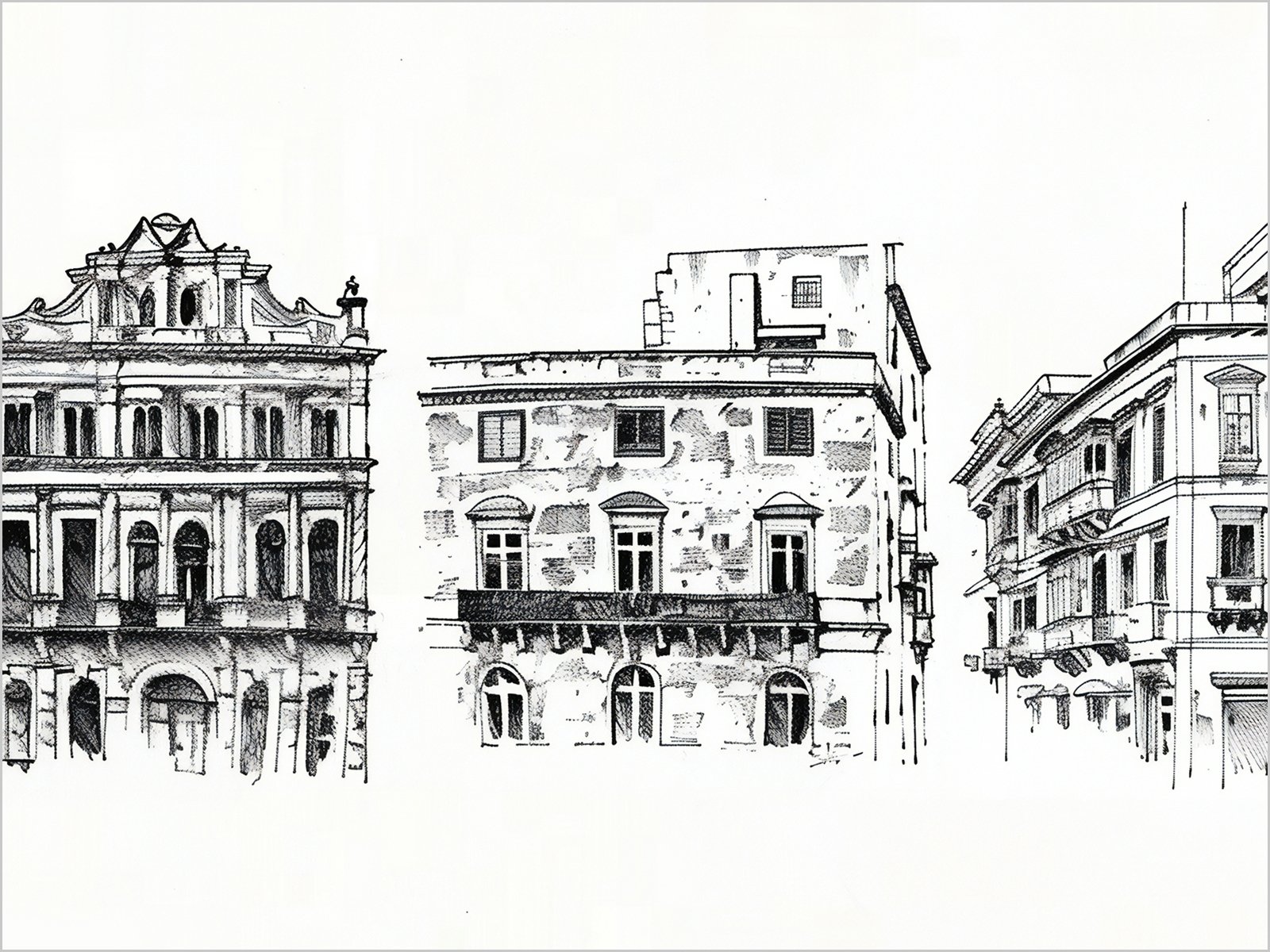 This painting features the facades of a series of ancient buildings, each rendered with precise lines and detailed shading. The structures showcase distinct architectural styles from different eras, exuding a sense of historical and artistic charm. The monochromatic tone highlights the details of the buildings, creating a solemn and nostalgic atmosphere. These edifices seem to quietly narrate stories of the past, allowing viewers to feel the weight of history and the passage of time.