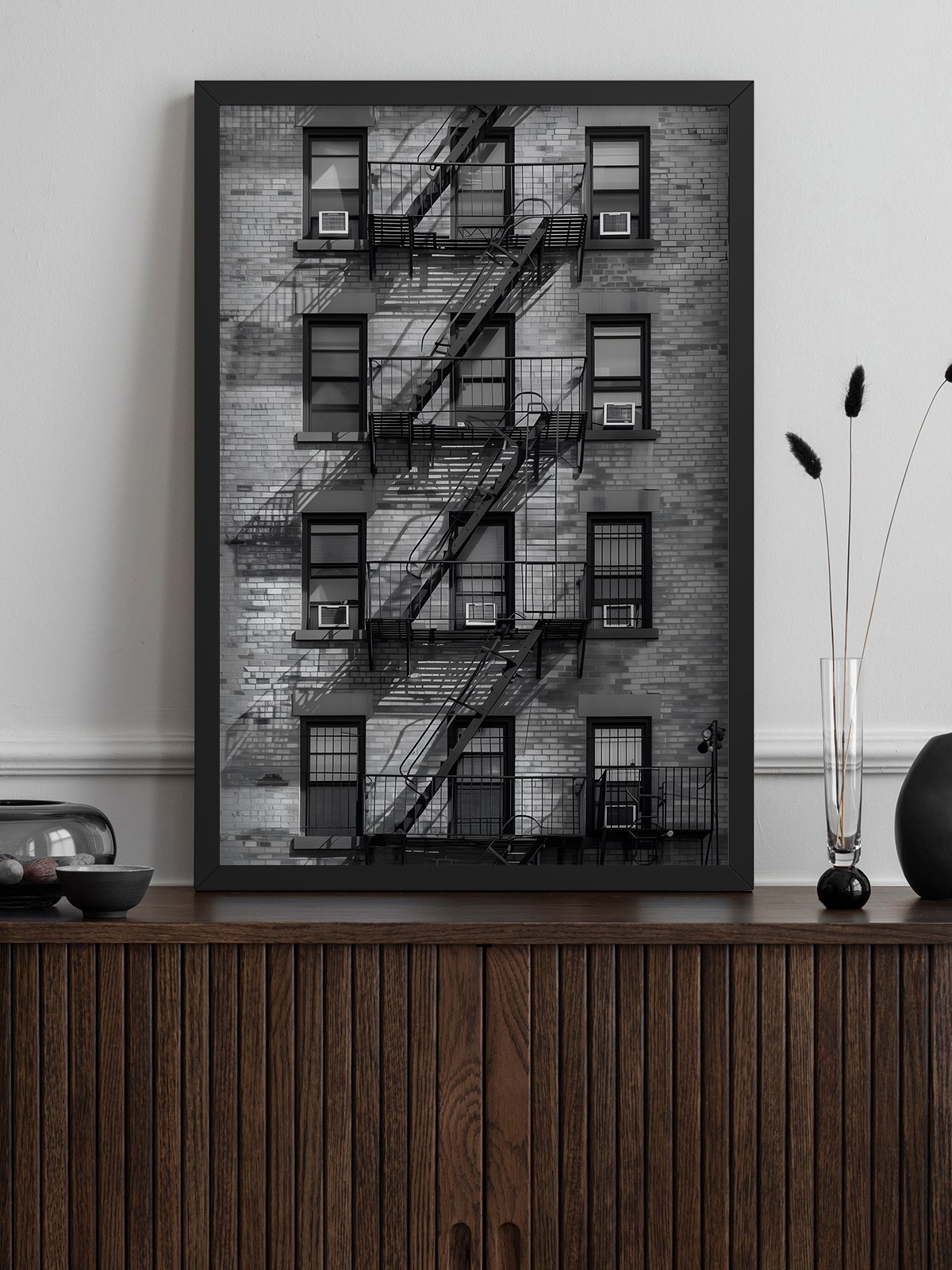 This photo features a brick building with an intricate fire escape structure on the exterior wall, highlighted in black-and-white tones to emphasize the interplay of light and shadow. The image conveys a sense of urban calmness and order, as if narrating hidden stories within city life.