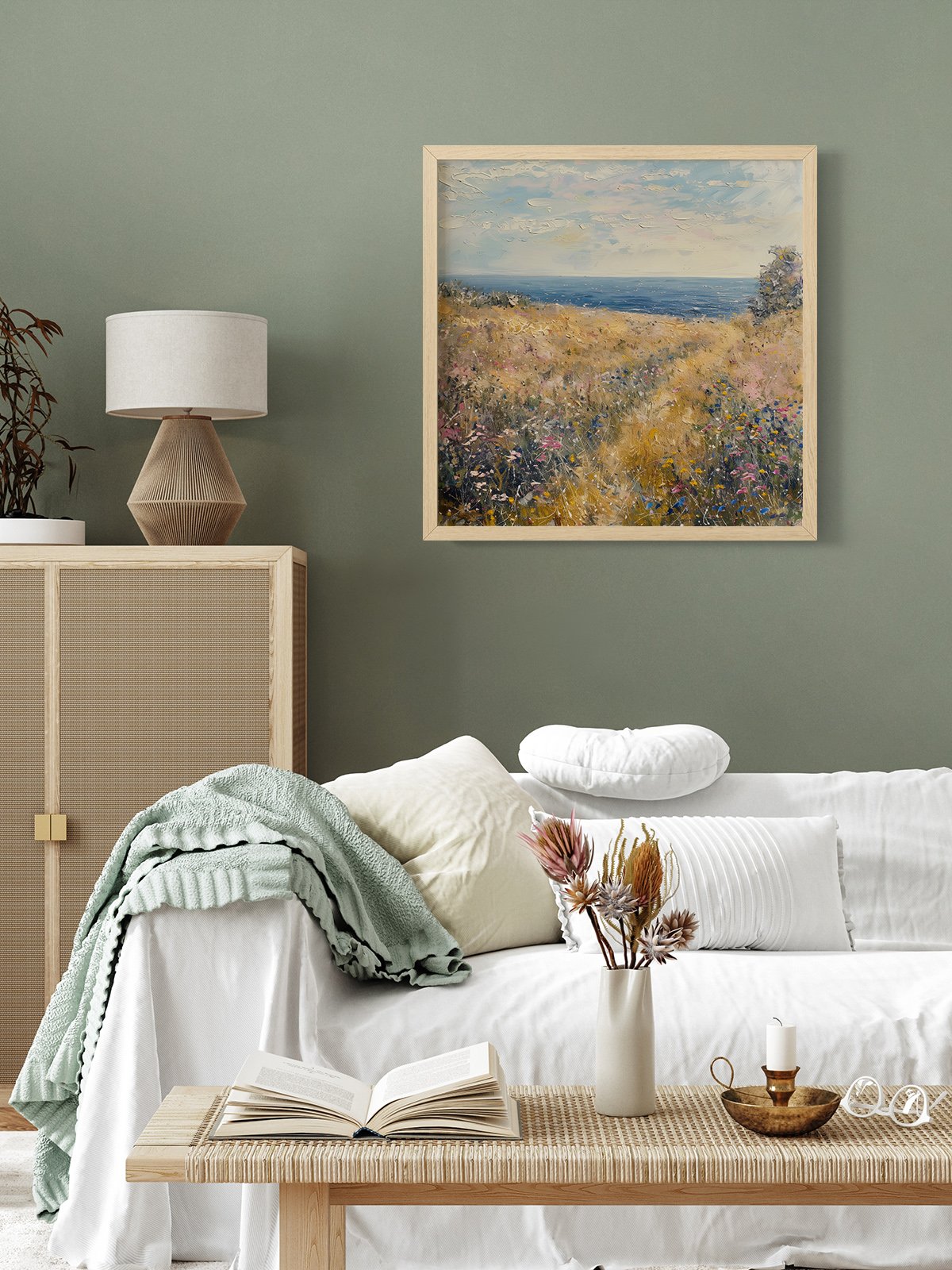 The painting depicts a vast flower field by the sea under a blue sky with white clouds. Colorful wildflowers sway on the golden grassland. The gentle sea breeze and the fragrance of flowers create a peaceful and beautiful scene, evoking a sense of serenity and the endless charm of nature.