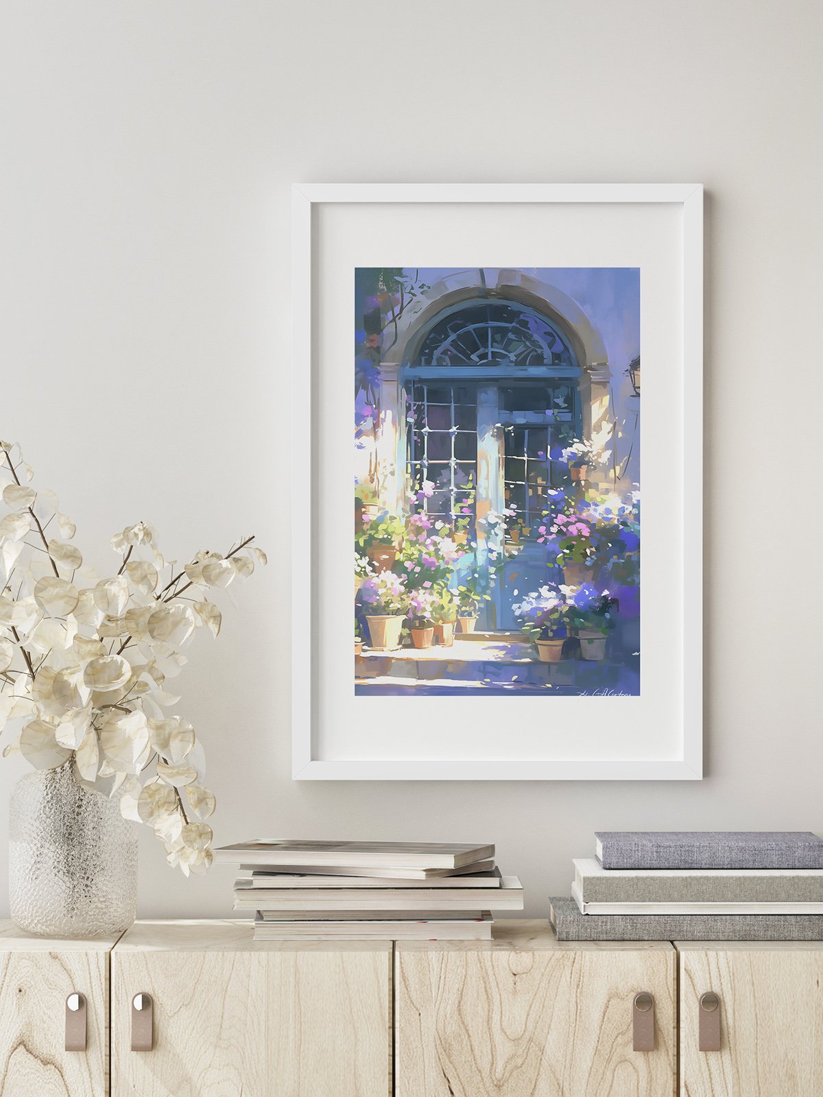 This painting depicts a porch brimming with flowers, with various potted plants placed in front. The colorful blossoms bloom under the sunlight. The blue door and arched window add a touch of rustic romance. Warm sunlight filters through the leaves, illuminating the flowers and the door, creating a cozy and tranquil scene.