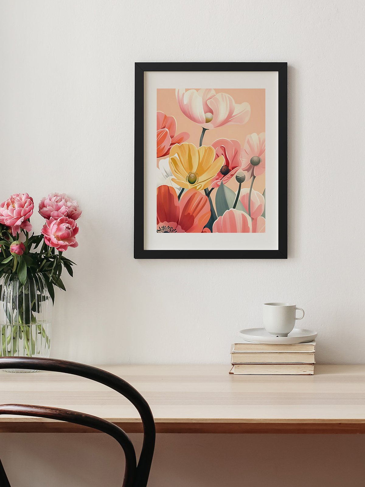 This painting depicts a vibrant flower market brimming with colorful and lively blooms. The flowers, in shades of red, yellow, pink, and white, each have their unique charm, conveying a sense of prosperity and vitality. The soft tones of the background evoke the warmth and energy of the flower market, immersing the viewer in a fragrant, blossoming world.