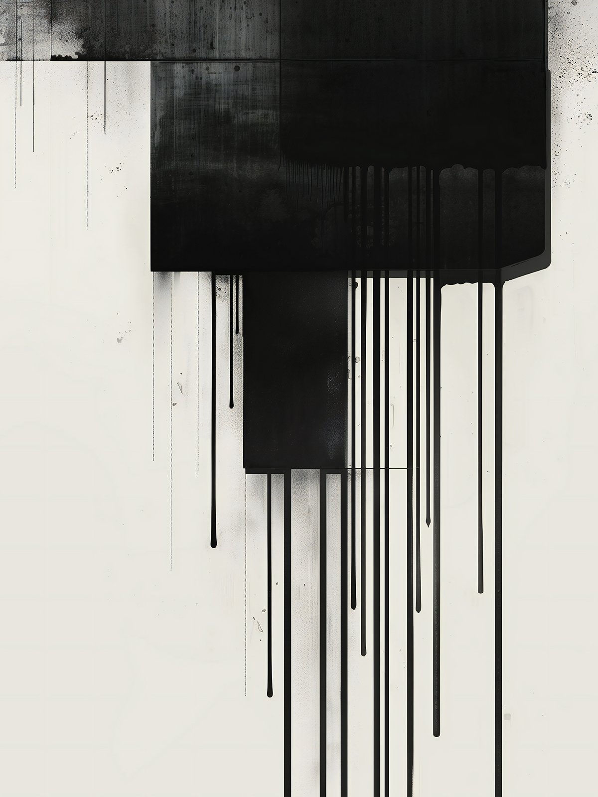This abstract painting, dominated by black and white tones, showcases the dripping effect of black blocks extending downward from the top of the canvas. Black paint flows from the edges of the blocks, forming vertical lines that suggest a continuous spread of darkness. The blank space on the left contrasts sharply with the dense black on the right, adding visual impact. This minimalist expression, through the contrast of colors and lines, evokes contemplation and emotional resonance in viewers about infinite extension.