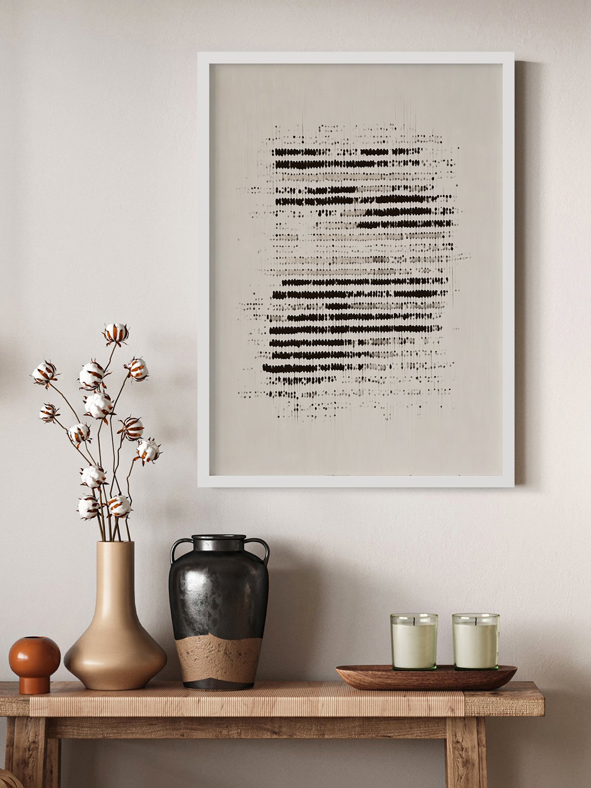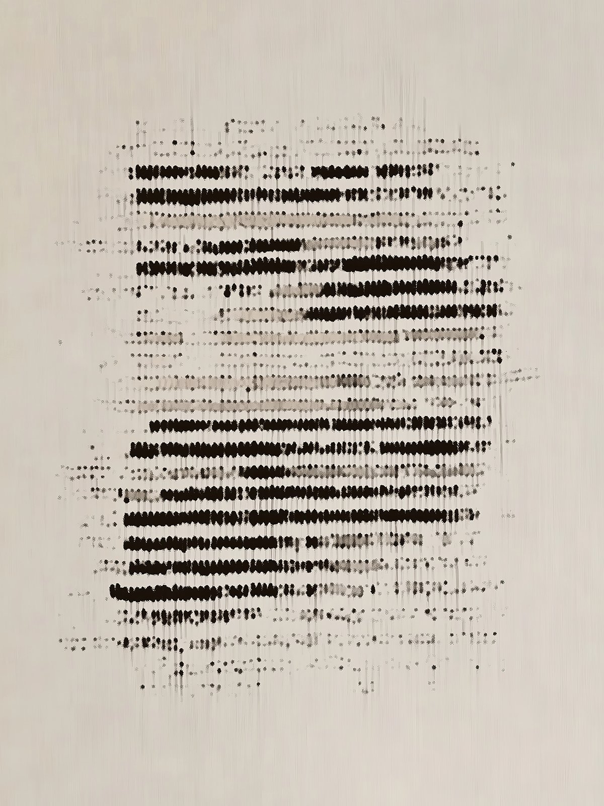 | 就像一条陈旧的信息,黑色的点阵暗示着褪色的文字——一种在消失前暂停的抽象低语,在最后的碎片中带着温暖和神秘。 |