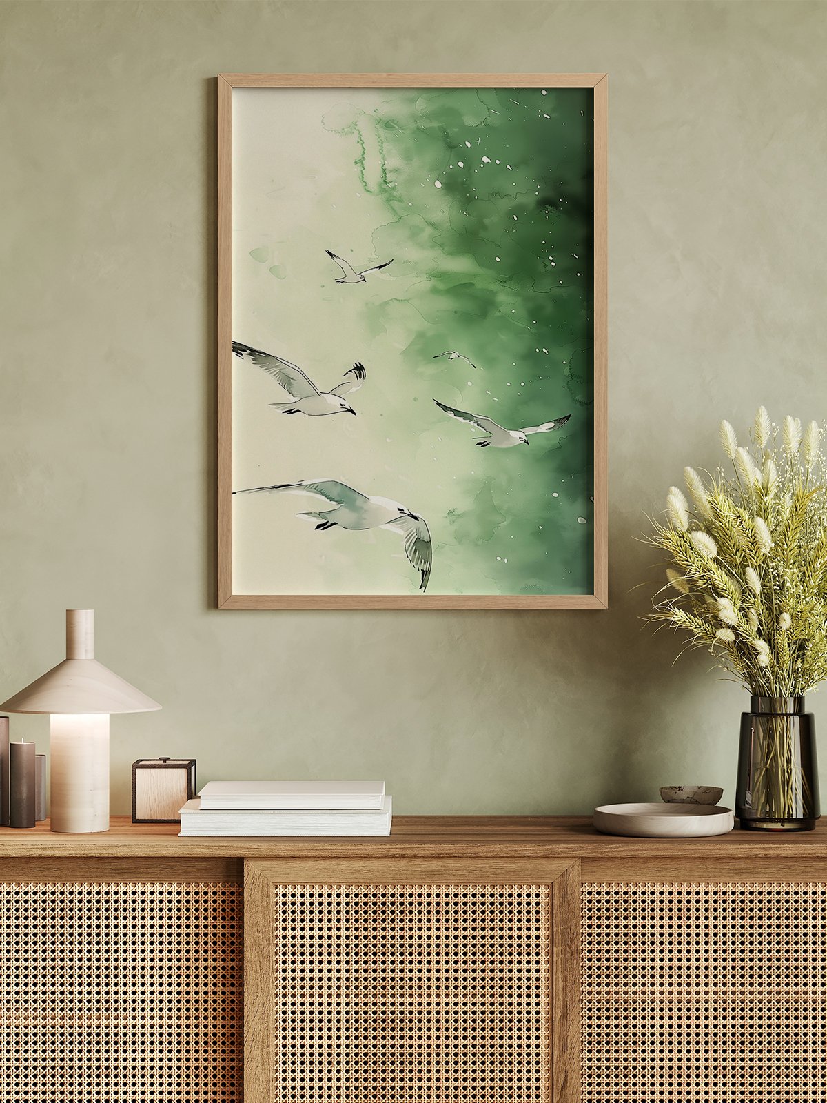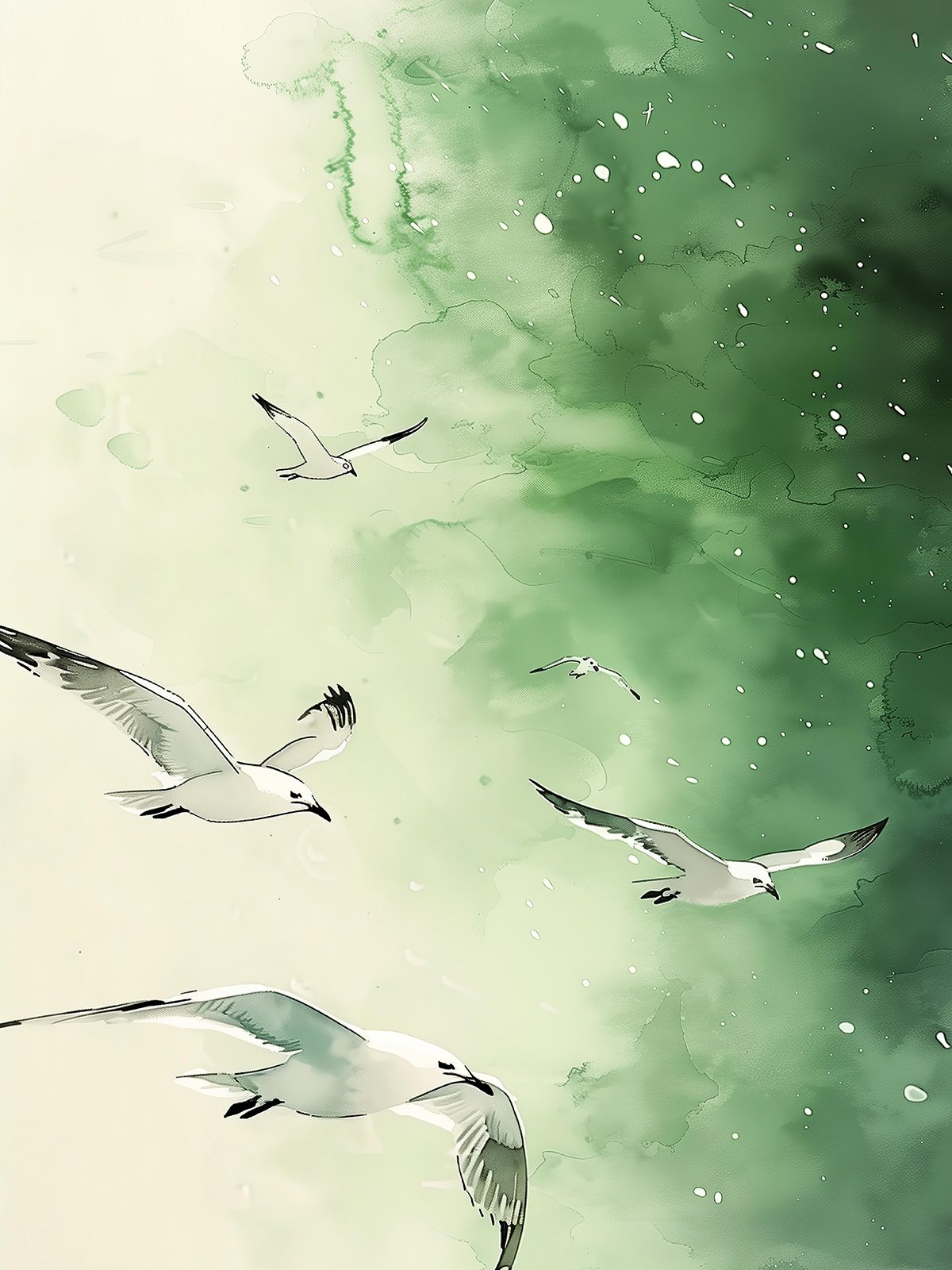 This painting depicts several seagulls soaring freely in a verdant sky, evoking a sense of tranquility and freedom. The green background contrasts sharply with the flying seagulls, conveying the beauty of nature and the vitality of life.