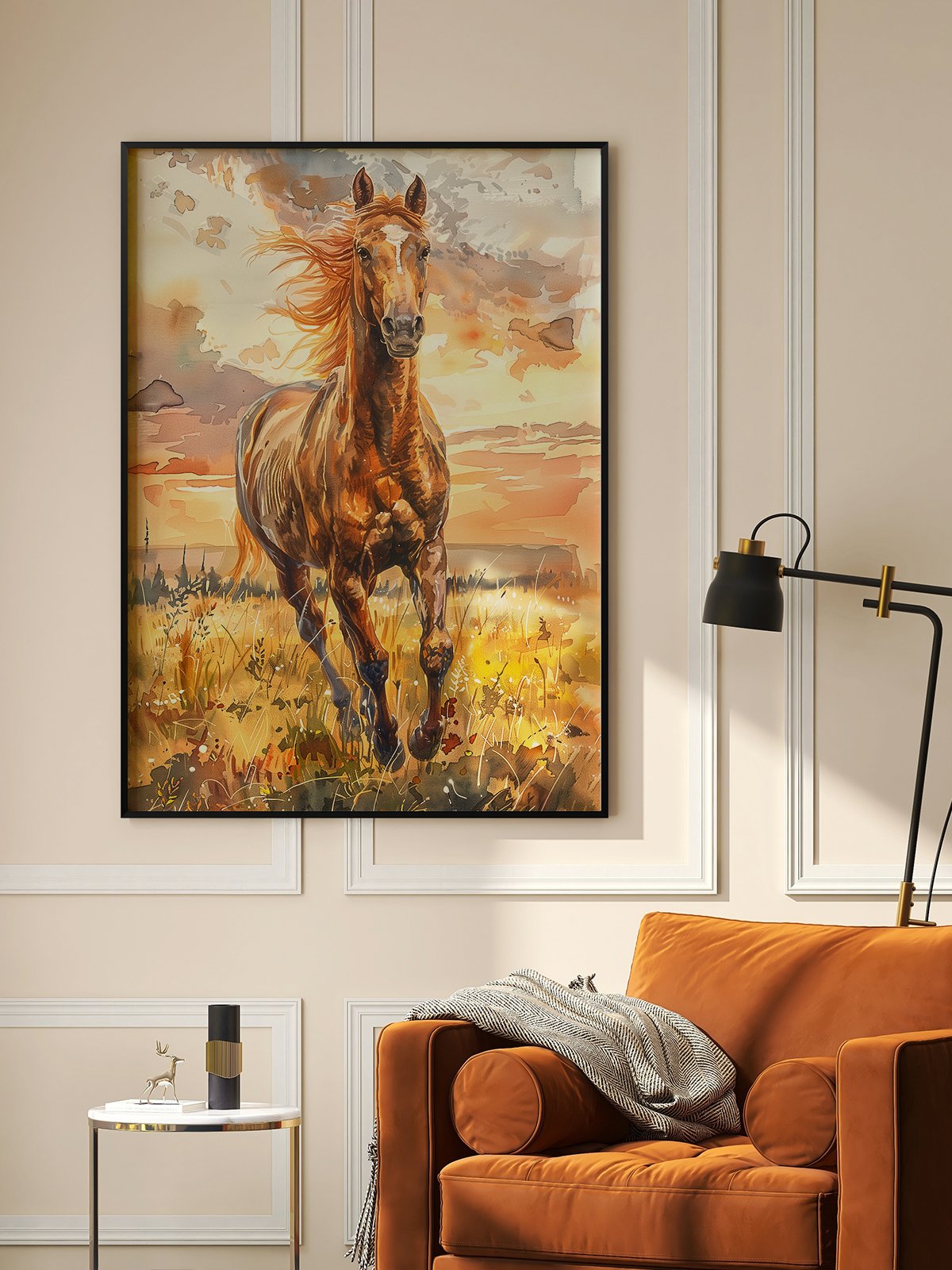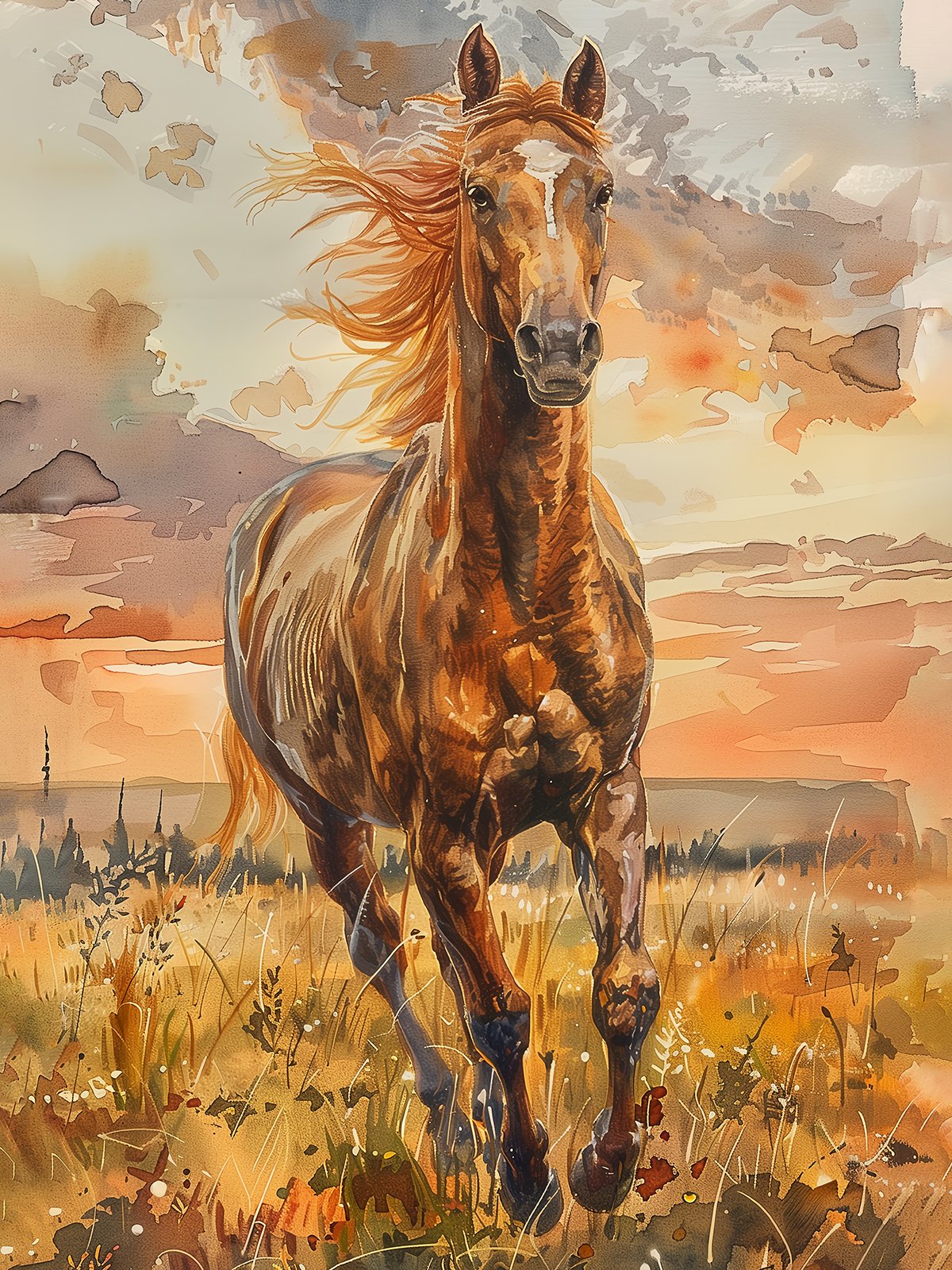 This artwork depicts a magnificent horse running freely across the prairie at sunset. In the artwork, the horse’s mane flows with the wind, its powerful body exuding strength, and its running posture is both elegant and forceful. The sun’s rays bathe the prairie in warm hues, with the clouds in the sky tinted golden and orange, creating a stunning backdrop. Through delicate brushstrokes and rich colors, the piece captures the grandeur of nature and the vitality of life, conveying a spirit of freedom and unrestrained energy, allowing viewers to feel the infinite charm of the natural world.