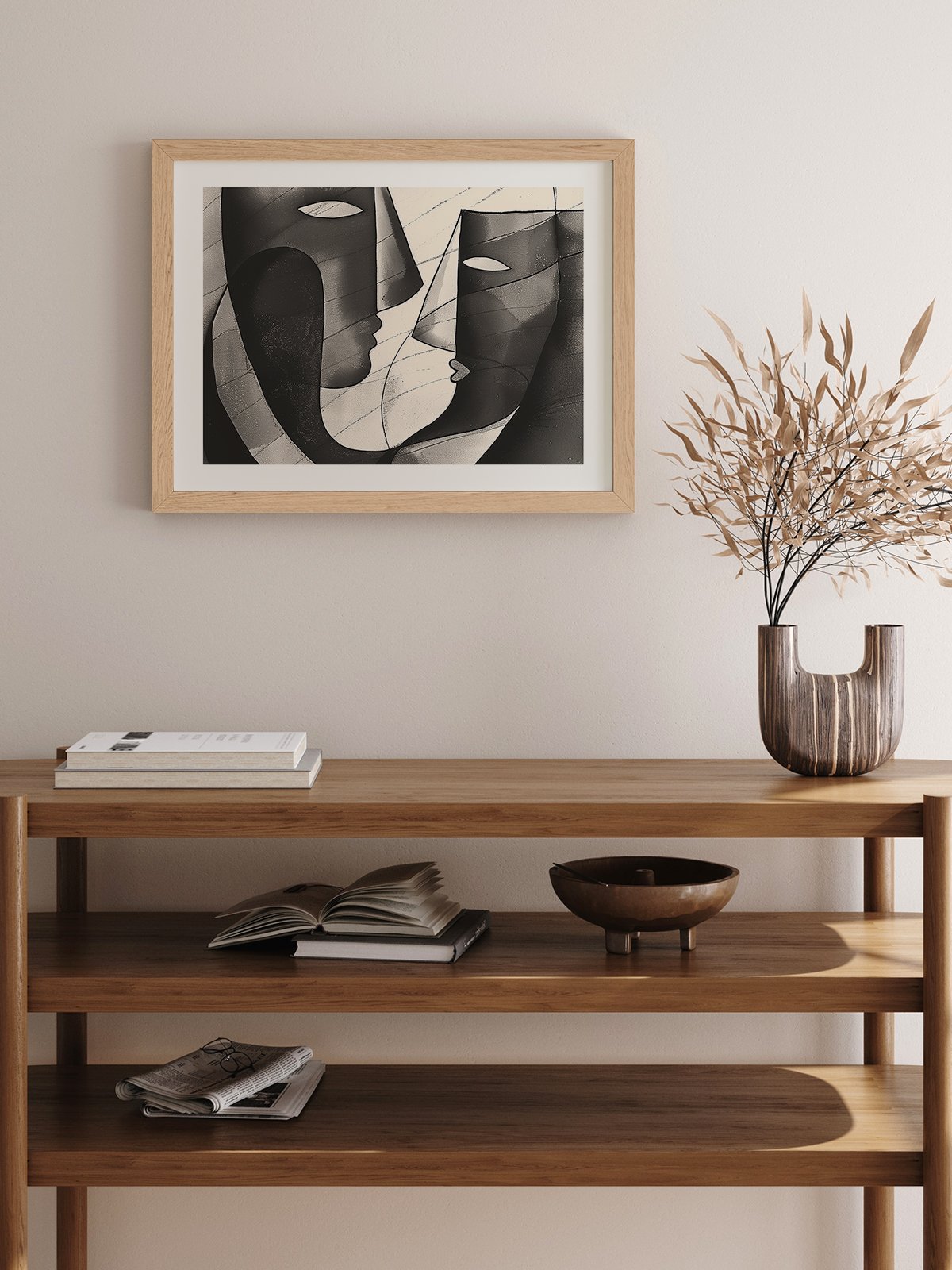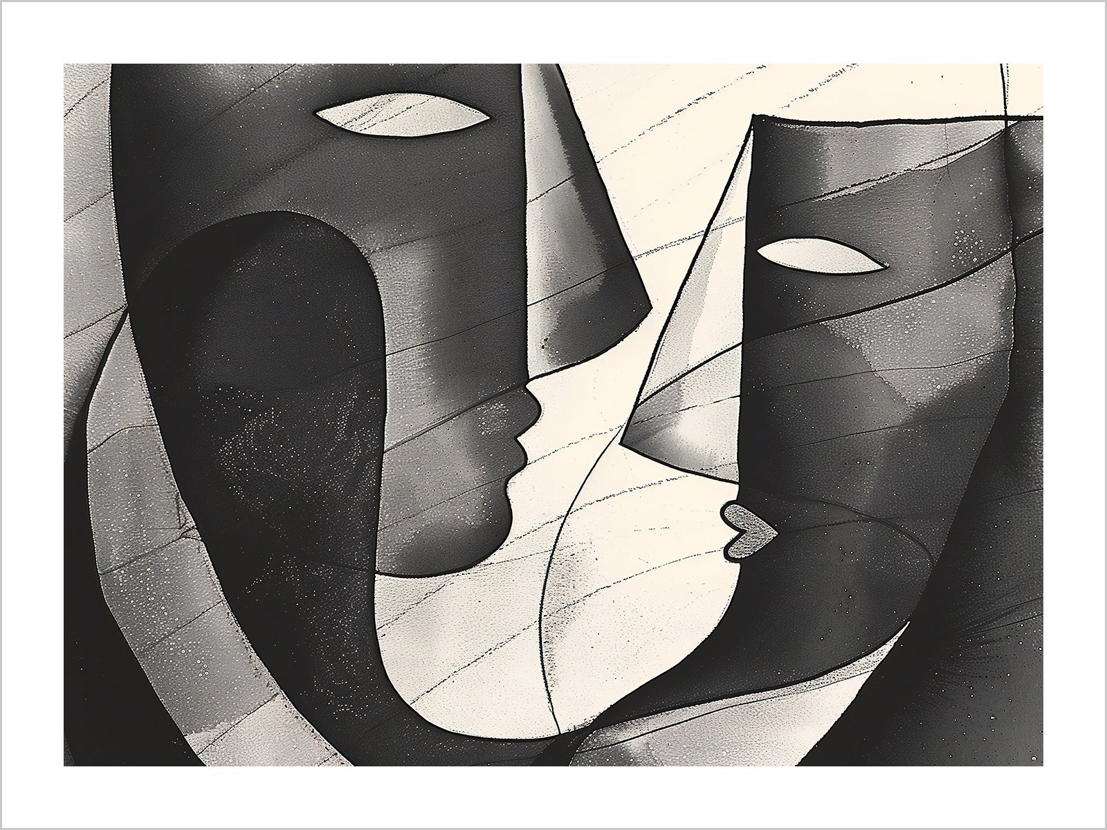 This abstract painting captures the intimate moment of two faces in close proximity, rendered in a minimalist yet evocative style. The composition features two stylized human profiles, their forms defined by fluid, sweeping lines and subtle gradients of black and gray. The eyes, simple and unadorned, meet in a silent exchange, creating a powerful sense of connection and understanding. The textured background adds depth to the scene, enhancing the ethereal quality of the figures. The interplay of light and shadow on their faces suggests a quiet, contemplative mood, inviting viewers to explore the unspoken dialogue between the two figures.