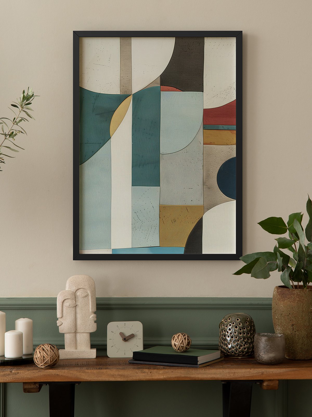 This abstract artwork features geometric shapes as the main elements, using a soft color palette to create a harmonious visual effect. The combination of different shapes and colors forms a complex yet orderly composition, with each color block and line responding to each other. The piece showcases the artist’s unique understanding of space and form. The overall simplicity and depth of the artwork convey a sense of tranquility and balance.