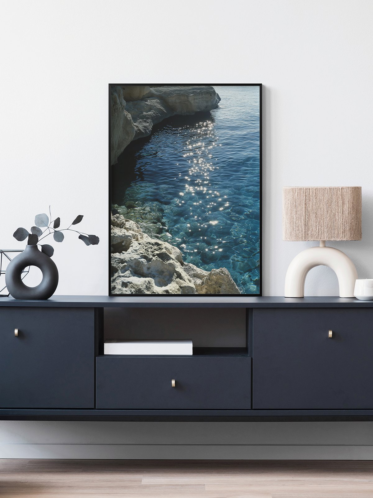 Glittering lights shimmer in the water, resembling stars descending to earth, adorning this mysterious blue. This photograph captures the perfect blend of water and light, evoking a sense of tranquility and beauty that transcends reality.
