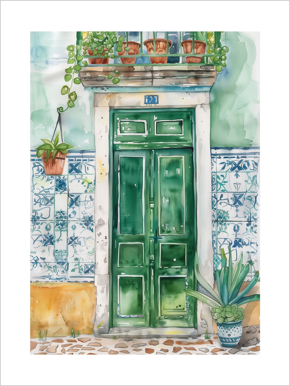 This painting depicts a large green door with a balcony above it, adorned with potted plants and greenery. The vibrant tiles and plants on the walls add liveliness to the scene, conveying a sense of warmth and nature.