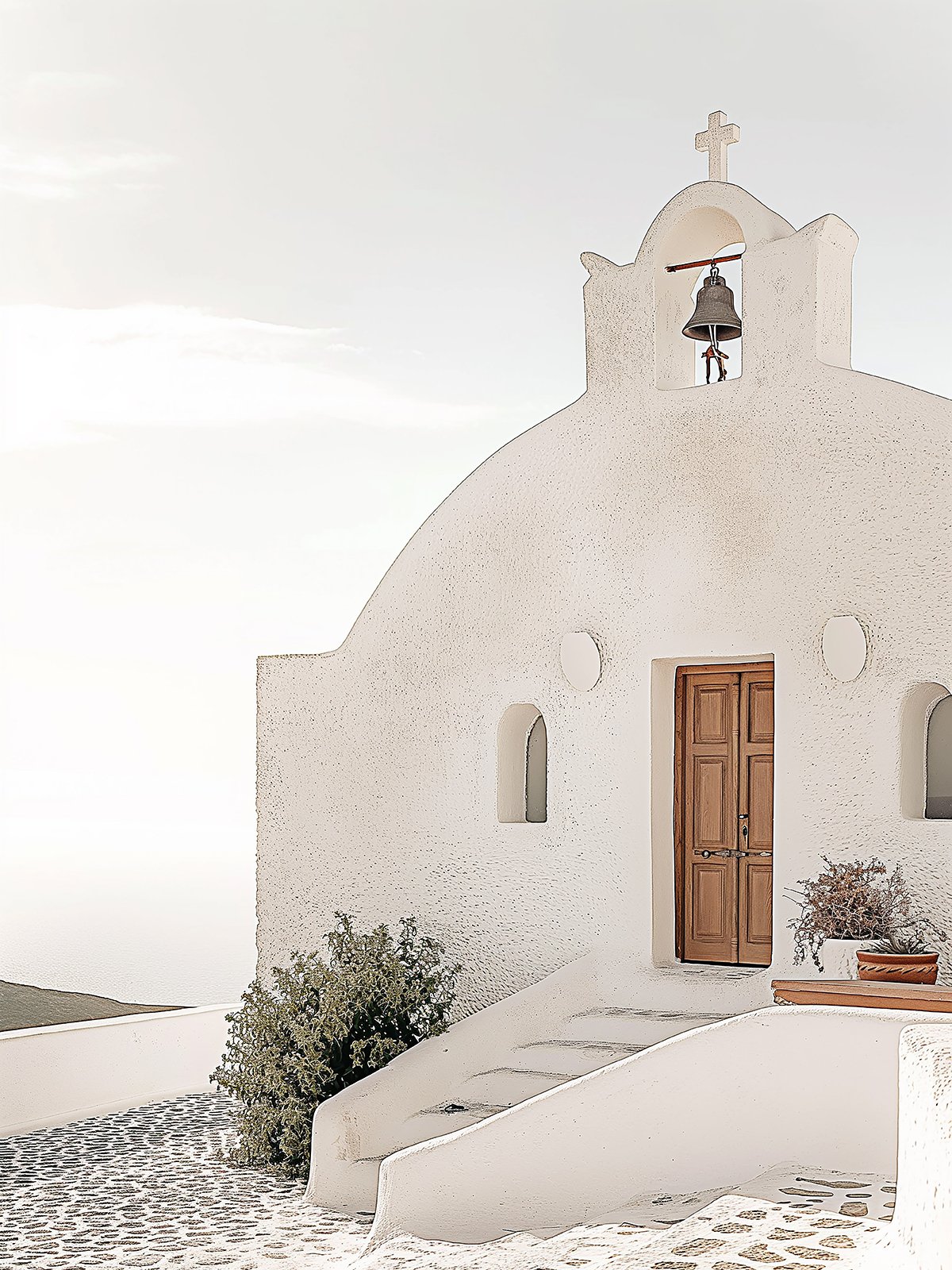 A white-walled, blue-domed Greek-style church stands quietly on the azure coast. The sea breeze gently blows, and the bell tolls melodiously, telling ancient legends and guarding the peace of the sea.