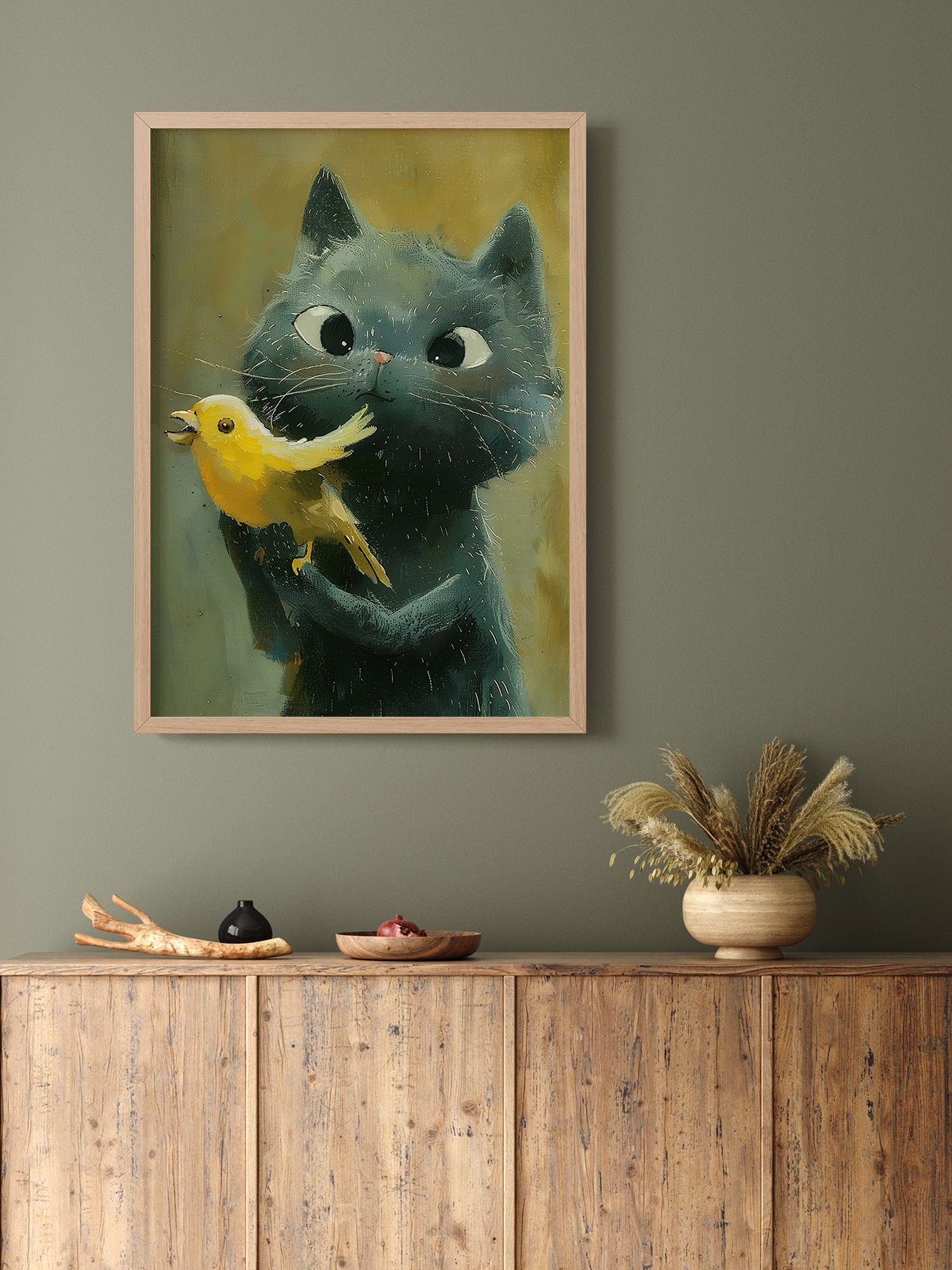 The black cat gently holds the little yellow bird, its eyes filled with tenderness, displaying a protective love. The bird lies peacefully, revealing its trust in the cat. With soft colors and delicate brushstrokes, the painting is filled with an atmosphere of love and peace, highlighting the beauty of harmonious coexistence among different forms of life.