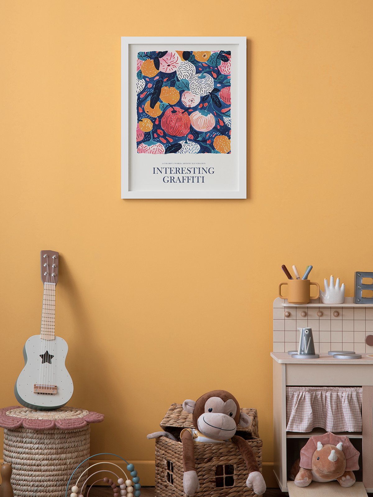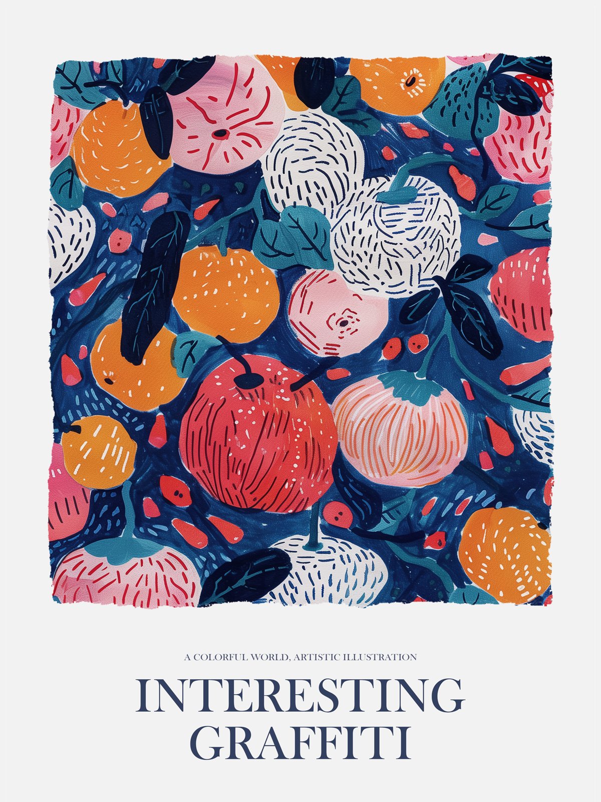 This artwork showcases the vitality and abundance of the harvest season through colorful fruits and leaves. The vibrant reds, oranges, and pinks contrast sharply with the deep blue background, creating a joyful atmosphere. Each fruit is full of life, symbolizing the joy of harvest.