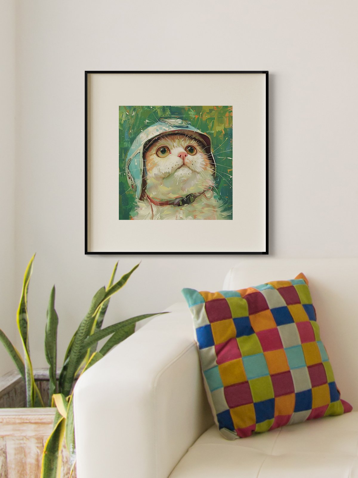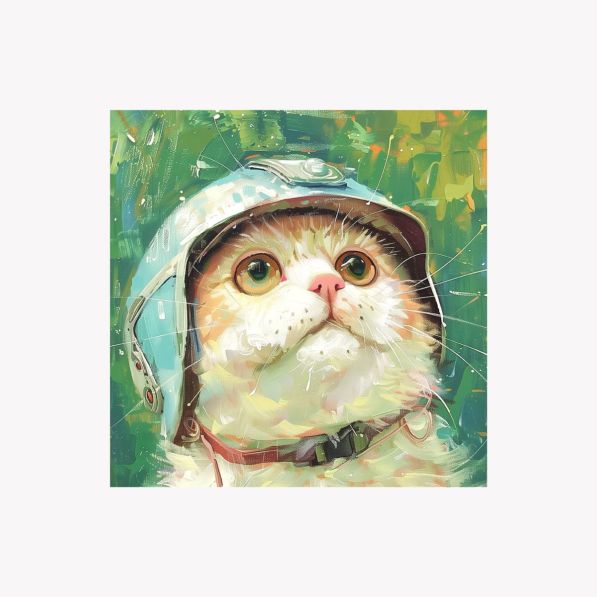 This painting gives people a lively and humorous feeling. The cat wearing a helmet has big and round eyes, looking curious and surprised. The background is an abstract color block of green and orange, which adds a bit of vitality and vitality to the entire picture. The whole picture is full of childishness and creativity, making people want to learn more about this unique world.