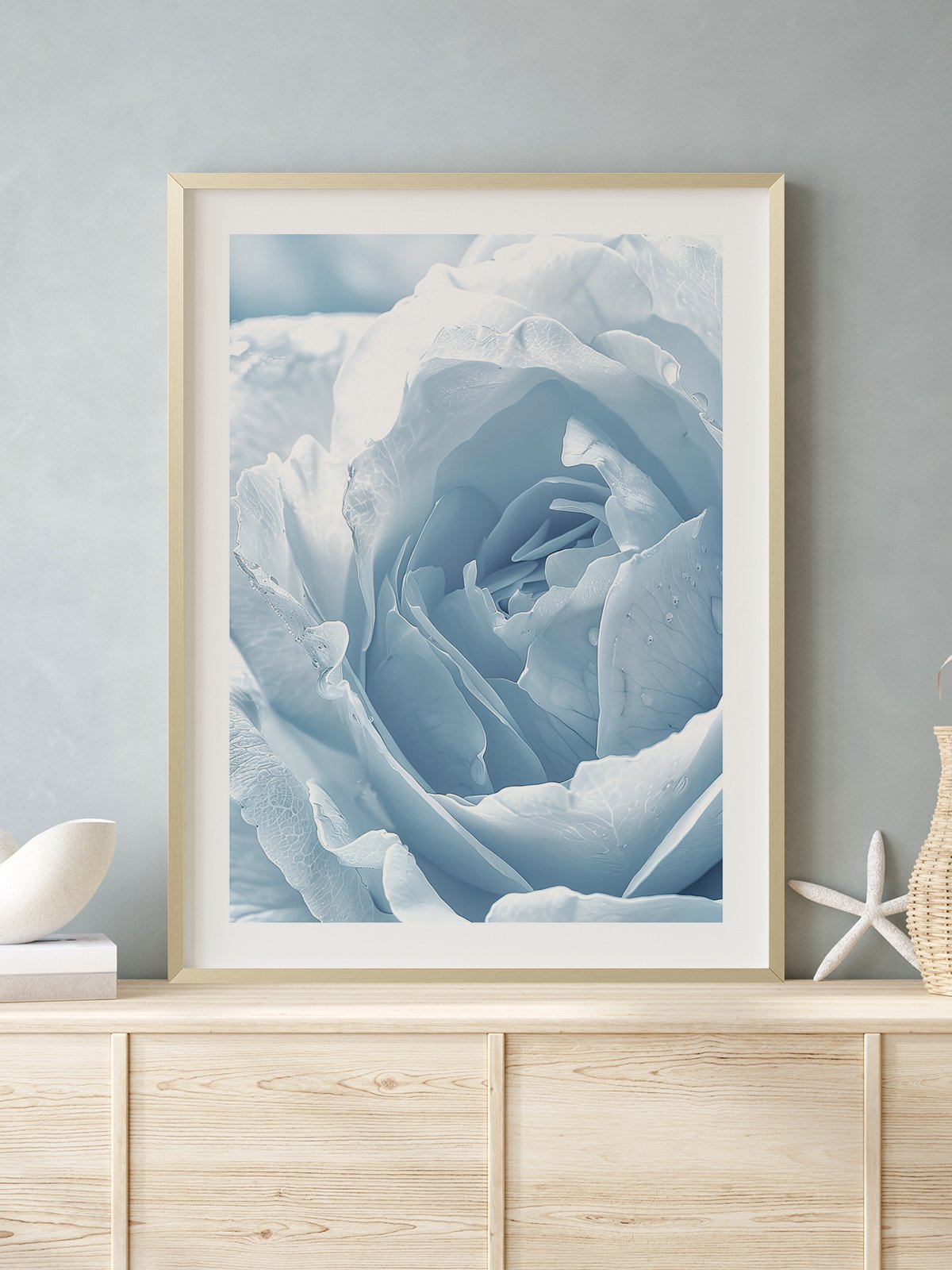This image showcases an ice-blue rose adorned with dew drops on its petals. The icy blue tones give the rose a calm and pure beauty, as if it is blooming in winter, evoking a sense of tranquility and freshness.