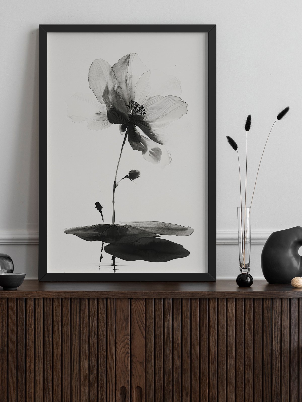 This artwork, rendered in a black and white ink style, depicts a graceful flower with delicate petals that seem to sway gently in the breeze. The piece evokes a sense of tranquility and subtle elegance, revealing a profound beauty that captures a fleeting moment in time with timeless grace.