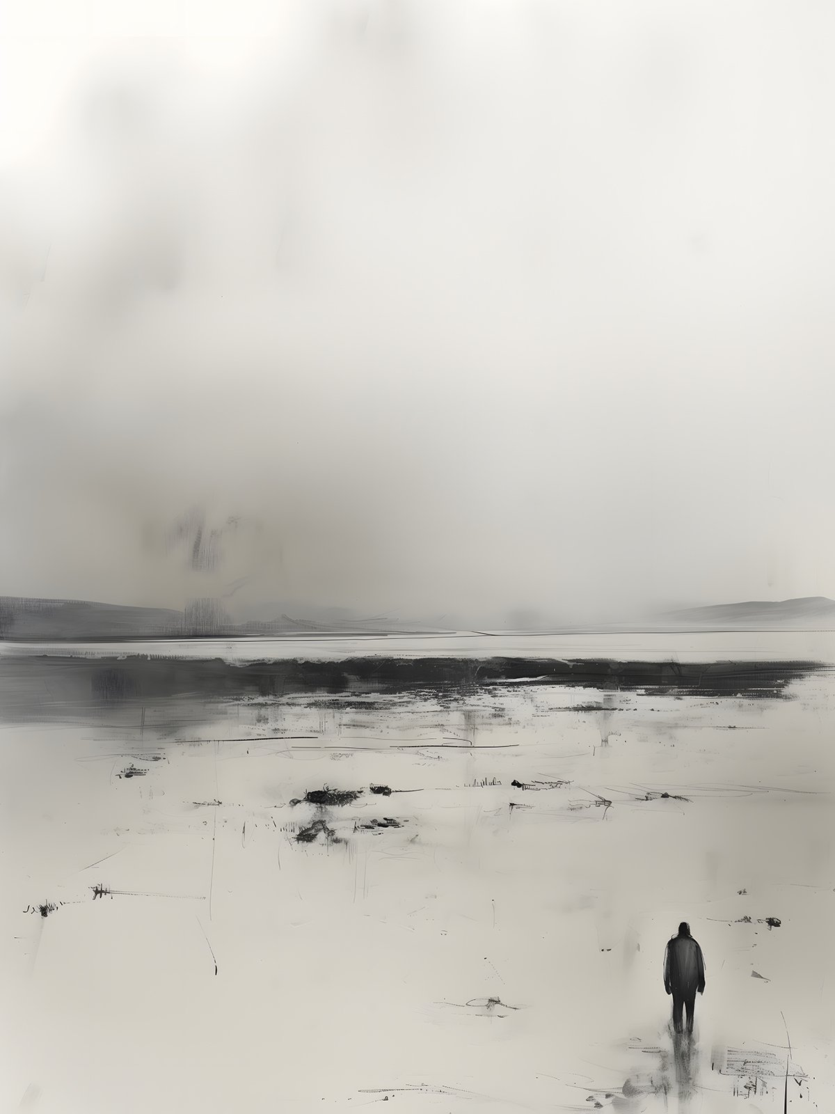 This black-and-white painting depicts a person walking alone in a vast wilderness, surrounded by endless plains and mist. The minimalist yet profound scene conveys a sense of loneliness, silence, and inner exploration, highlighting the delicate relationship between humans and nature.