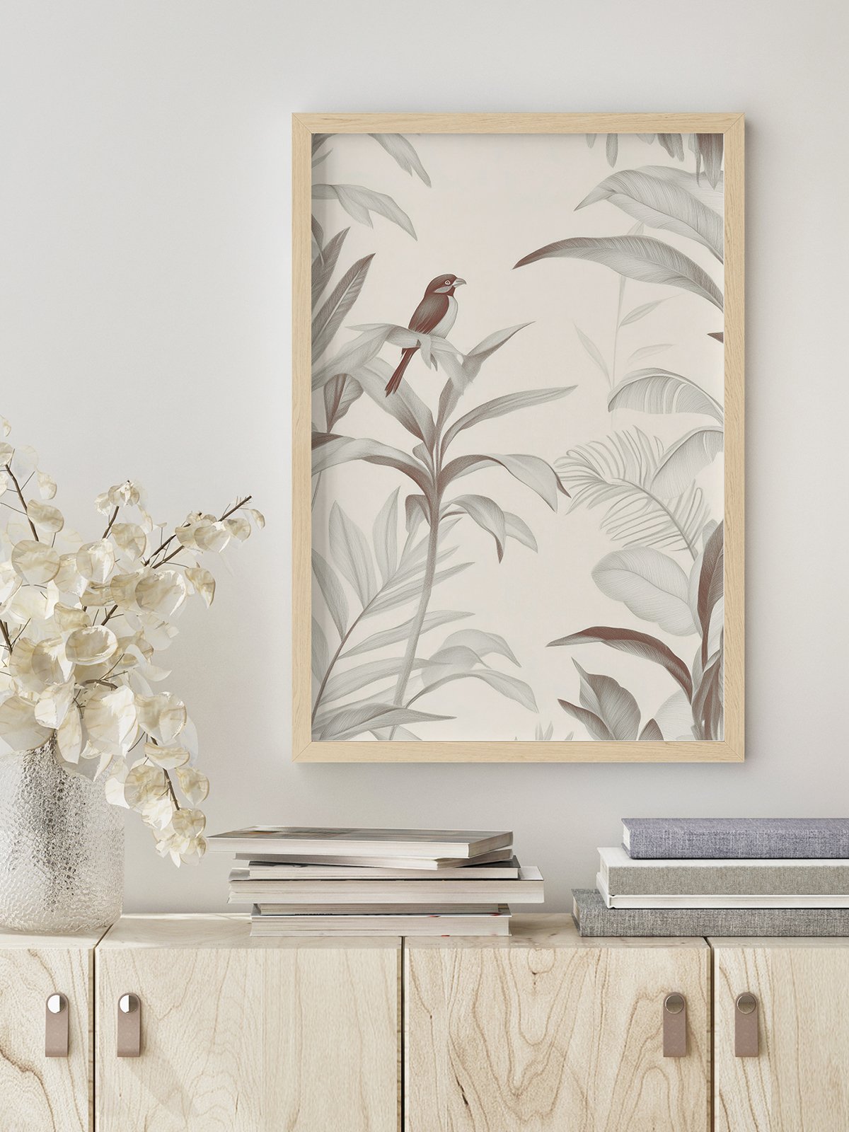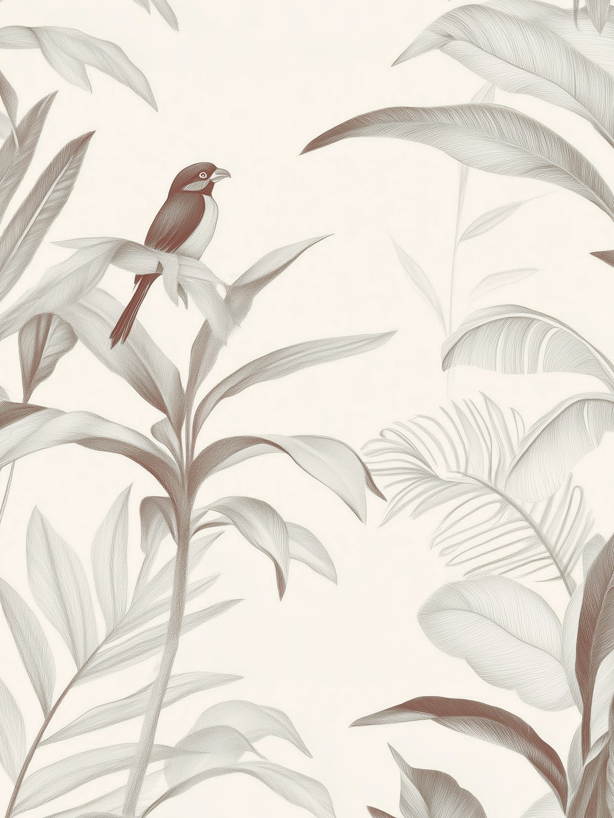 | A lone bird perches quietly amidst softly sketched tropical foliage. The composition exudes stillness and balance, as if time has gently slowed. |