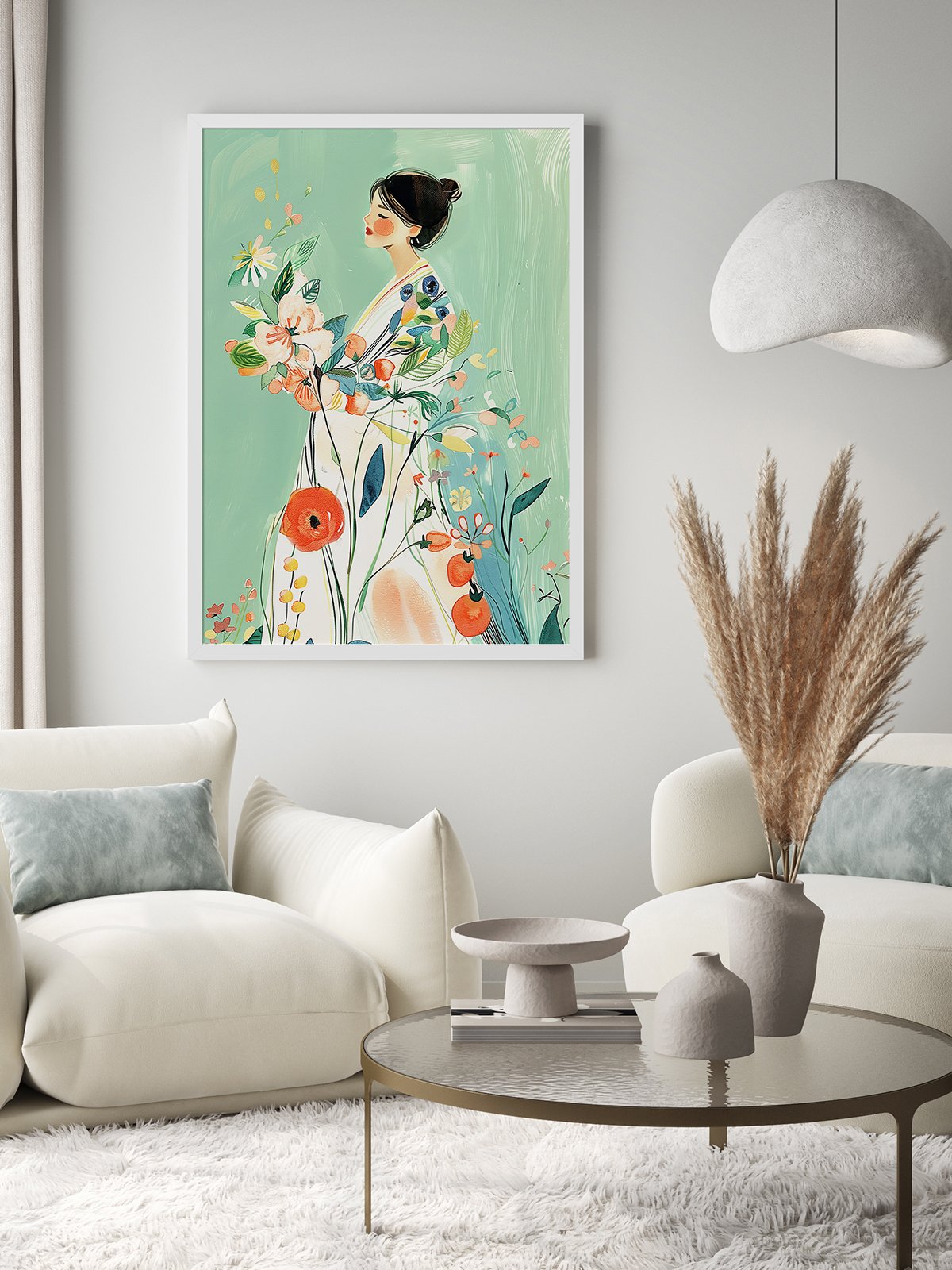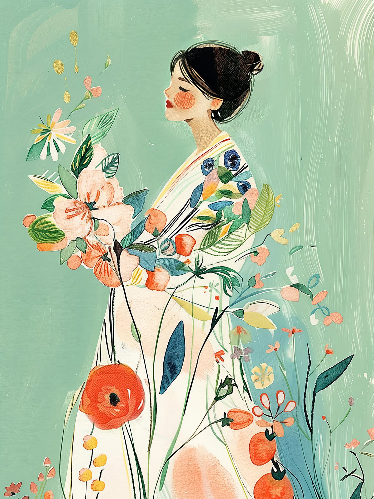 This image depicts a woman holding a bouquet of flowers, dressed in elegant attire, surrounded by colorful blossoms. The light green background adds a fresh and refined touch to the scene, conveying a sense of tranquility and grace, as if she is in a serene garden.
