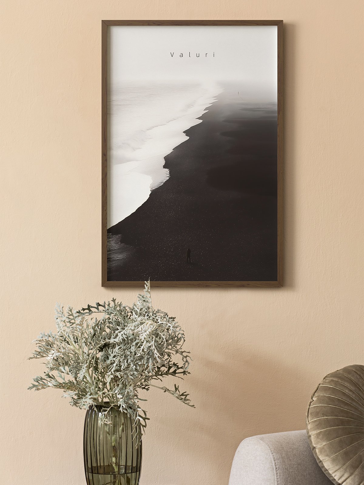 This picture depicts a vast sand beach with white waves crashing against the shore. The distant coastline fades into the dense fog, and a solitary figure stands on the beach, seemingly deep in thought. The scene evokes a sense of tranquility and solitude.
