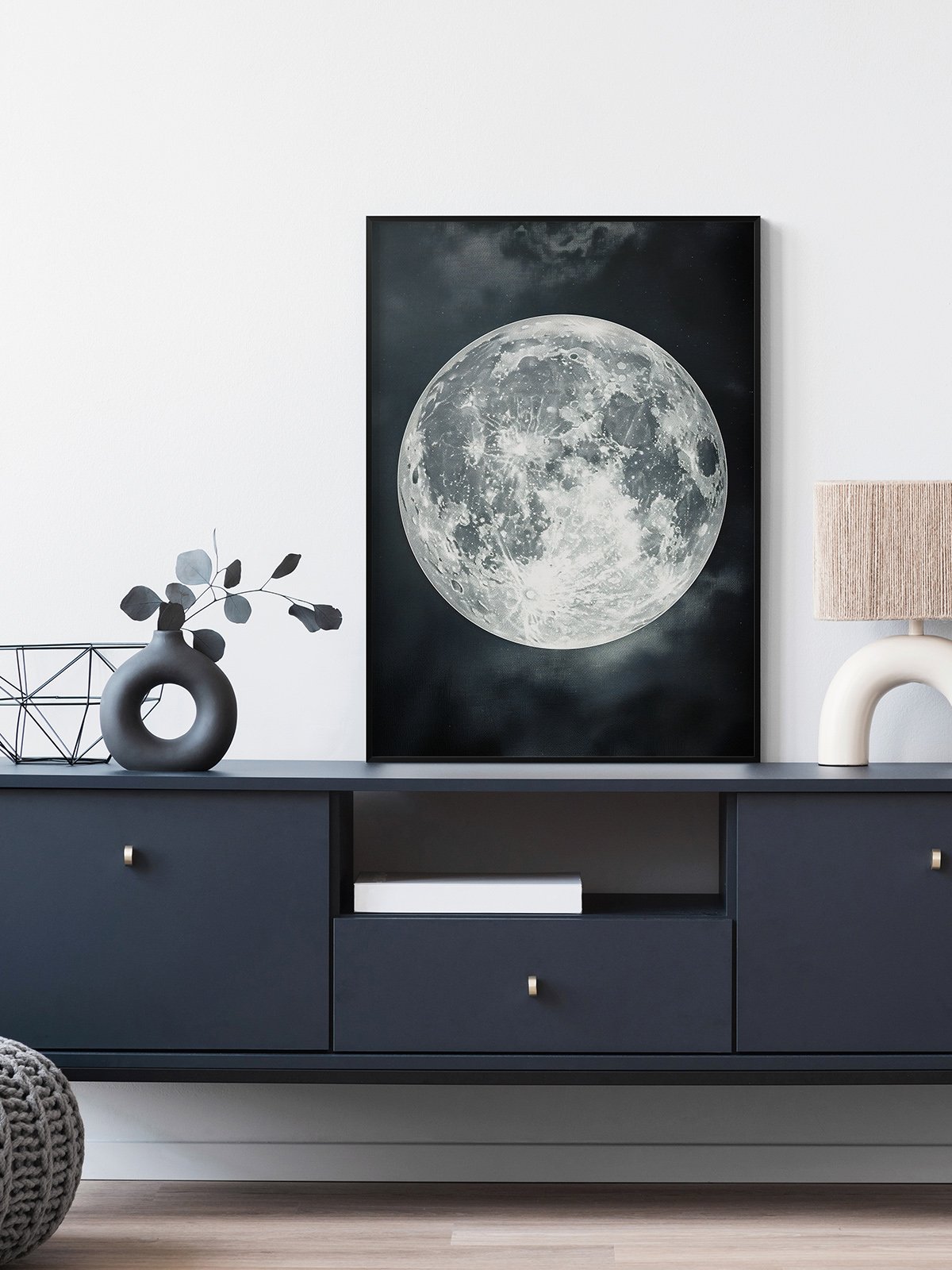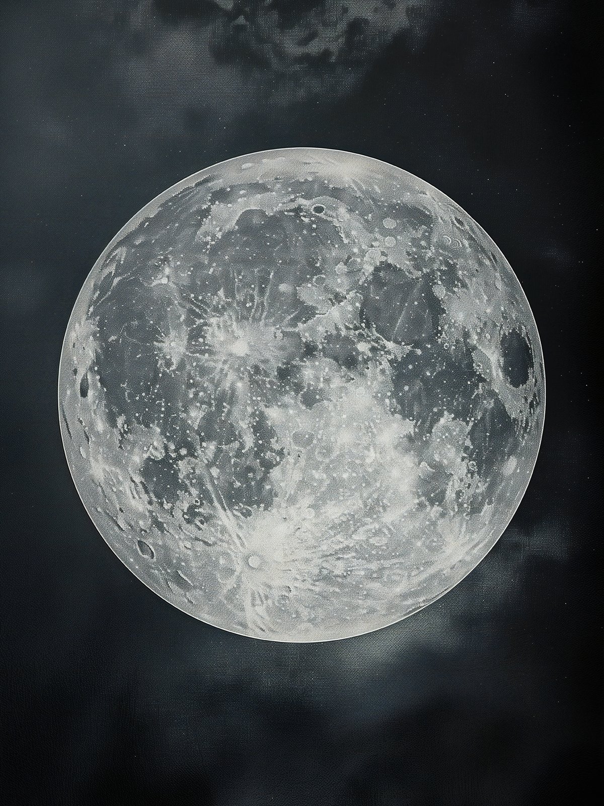 This black-and-white photograph captures a bright full moon, meticulously detailing the textures and craters on its surface. The full moon stands out vividly against the dark night sky, emitting a serene and mysterious glow. The faint presence of clouds adds a layer of depth to the scene, evoking thoughts of the vastness and mysteries of the universe. The entire piece is filled with admiration for natural wonders and awe for the enigmas of the cosmos.