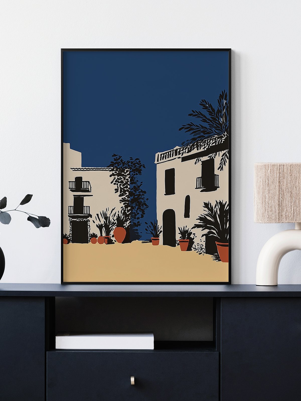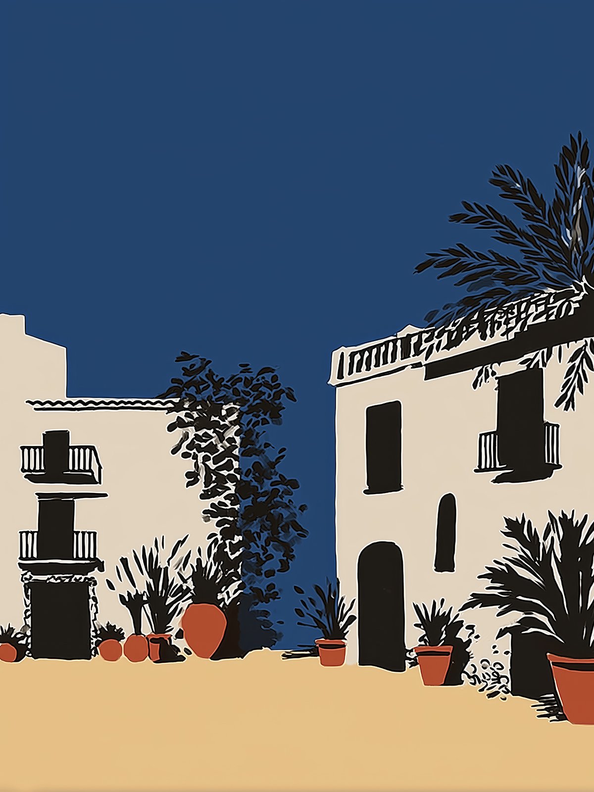 As dusk falls, whitewashed buildings stand quietly beneath the deep blue Maltese sky. Potted plants scatter the square, capturing the tranquility of a Mediterranean evening. The minimalist strokes speak softly of stillness and slow living—a peaceful pause in time.