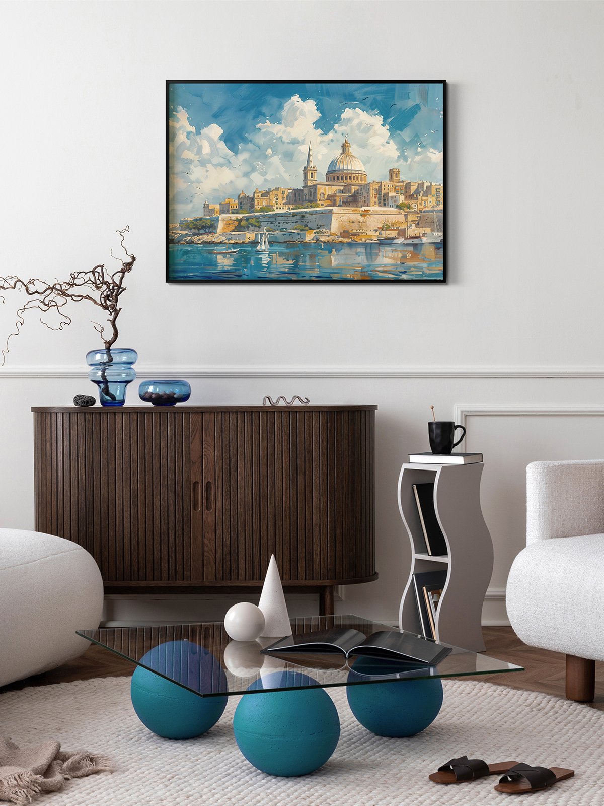 This watercolor painting depicts the beautiful coastal scenery of Malta. The typical Maltese architecture stands out brilliantly under the sunlight. The domed church and spires rise prominently against the city skyline, symbolizing Malta’s rich history and culture. The water in the foreground, with its mottled blues and greens, reflects the colors of the sky, evoking a sense of tranquility and delight. Through soft hues and delicate brushstrokes, the painting vividly captures the unique charm and captivating coastal splendor of this Mediterranean city.