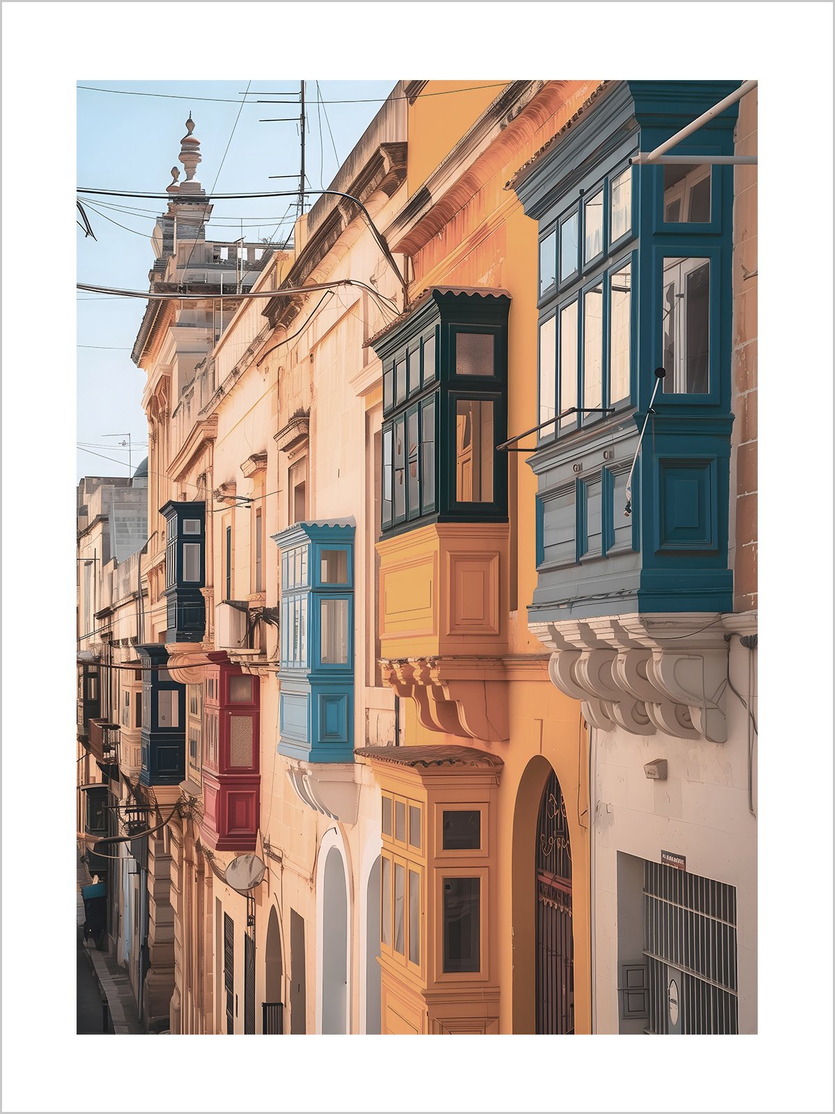 Showing a vibrant urban landscape, the windows on the buildings on both sides are like a palette, with red, blue and yellow intertwined like a vivid oil painting. Sunlight shines through the windows, dyeing the streets in warm tones. The overall picture is vivid, conveying the unique charm of the Mediterranean city.
