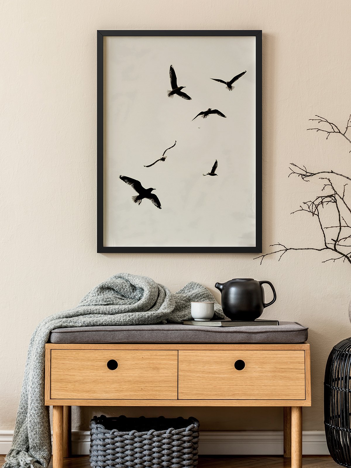 This image captures a flock of birds in flight, soaring freely in the sky, showcasing the beauty of nature and the vitality of life. The birds’ graceful postures against the vast, endless sky evoke a sense of freedom, lightness, and boundless possibilities.