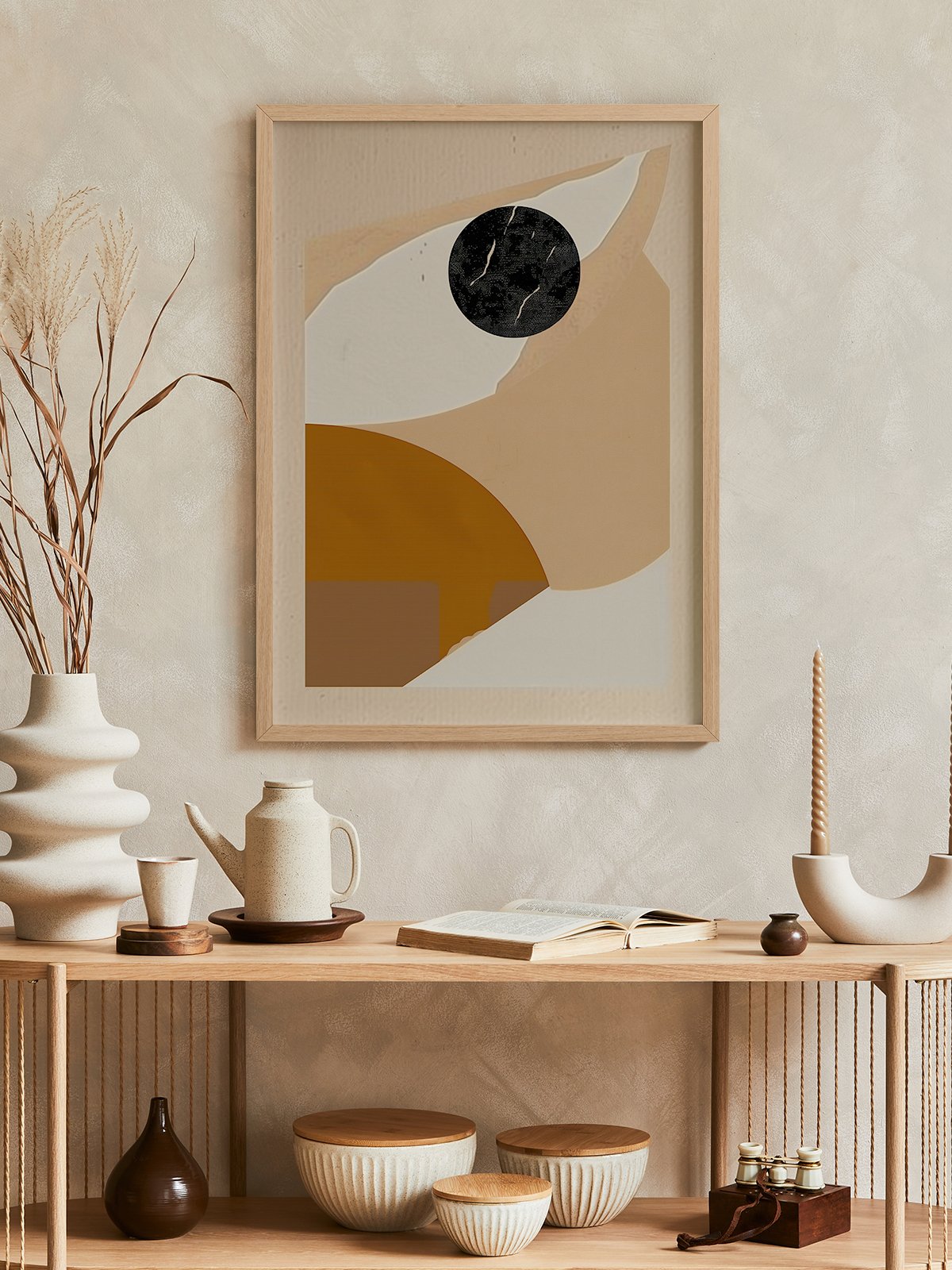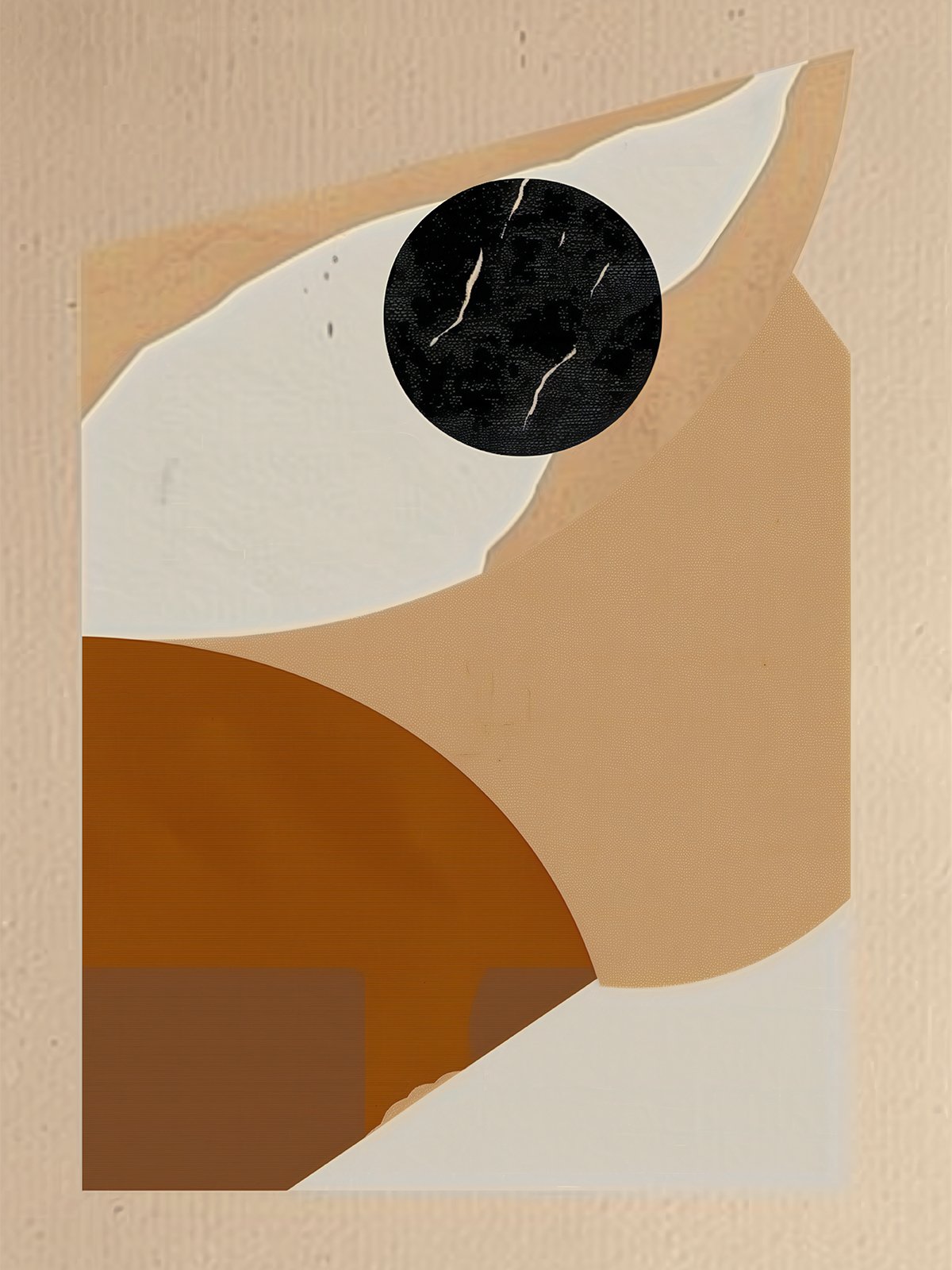 A minimalist abstract geometric painting in warm beige and brown tones, accented with a black circular element. The lines are simple and the composition is smooth, conveying a sense of tranquility and balance. Perfect for modern interior decor, adding a touch of artistic flair and spatial depth.
