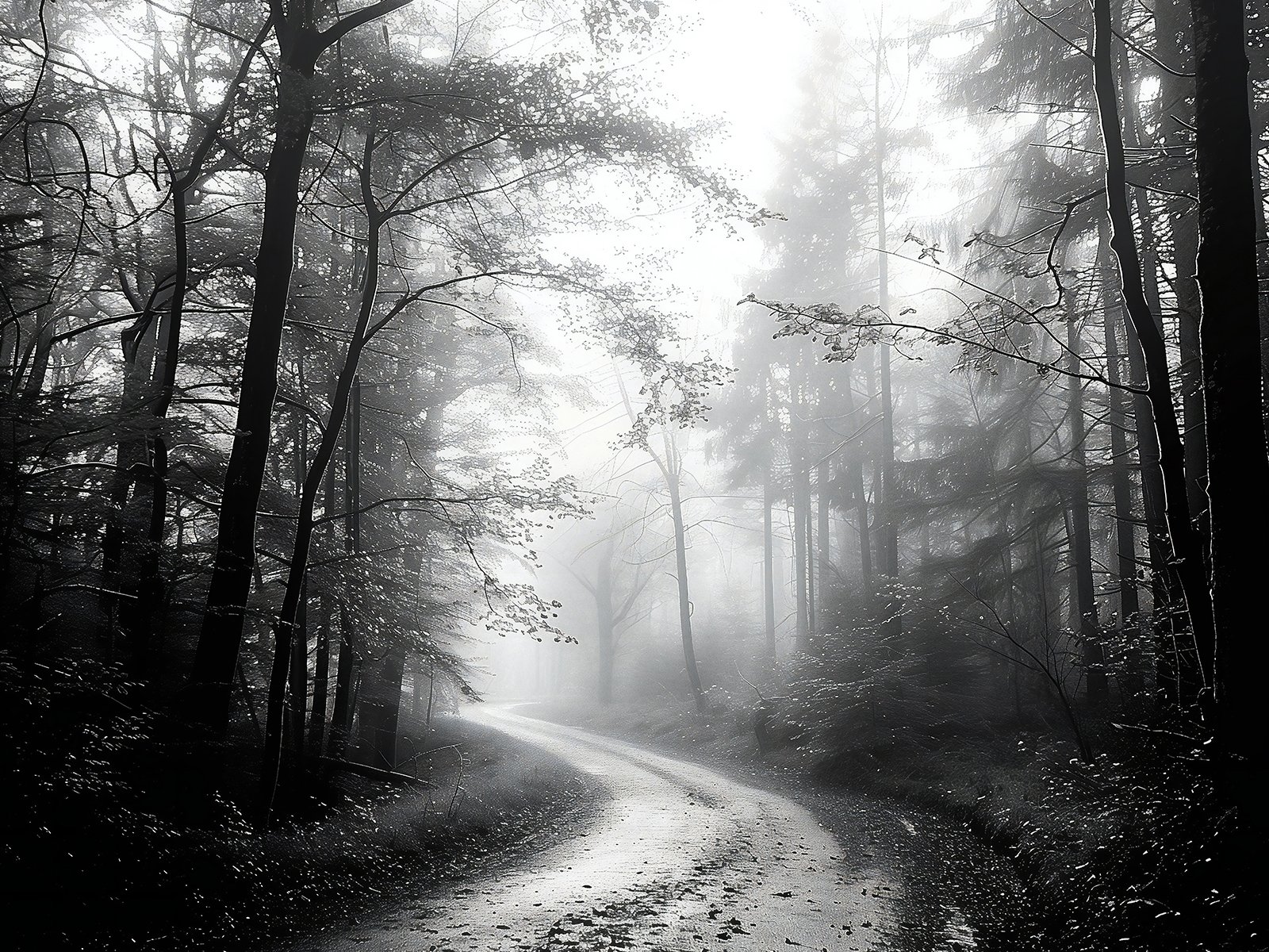 A winding path disappears into the depths of the mist, mysterious and serene. Morning light filters through the branches, creating a dreamy atmosphere. Tall trees stand like guardians on either side, offering a sense of quietness with a touch of mystery. This scene seems to invite you into an unknown adventure.