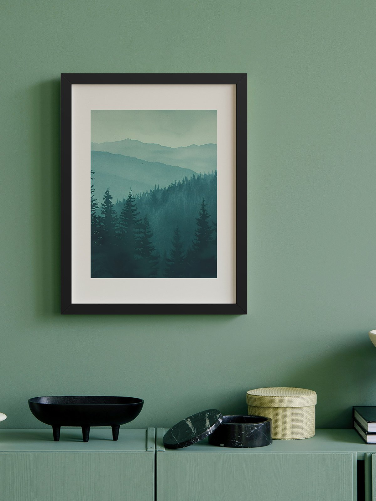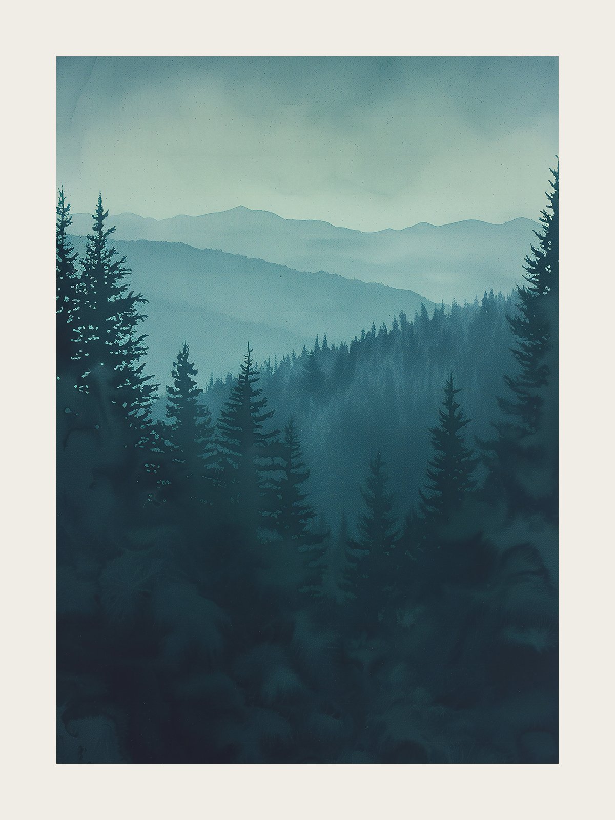 Layer upon layer of mountain ranges emerge through the thin mist, with the silhouettes of pine trees outlining the tranquility and grandeur of nature. The blue-green tones of the painting create a serene and mysterious atmosphere, as if entering a distant and peaceful dream.