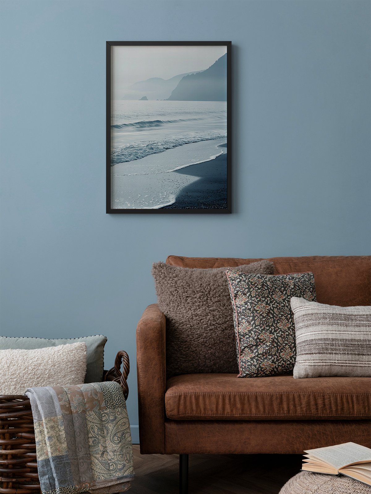 This picture showcases a serene coastline with gentle waves lapping the shore, and distant mountains shrouded in mist. The whole scene is filled with tranquility and a sense of mystery, evoking feelings of peace and relaxation.