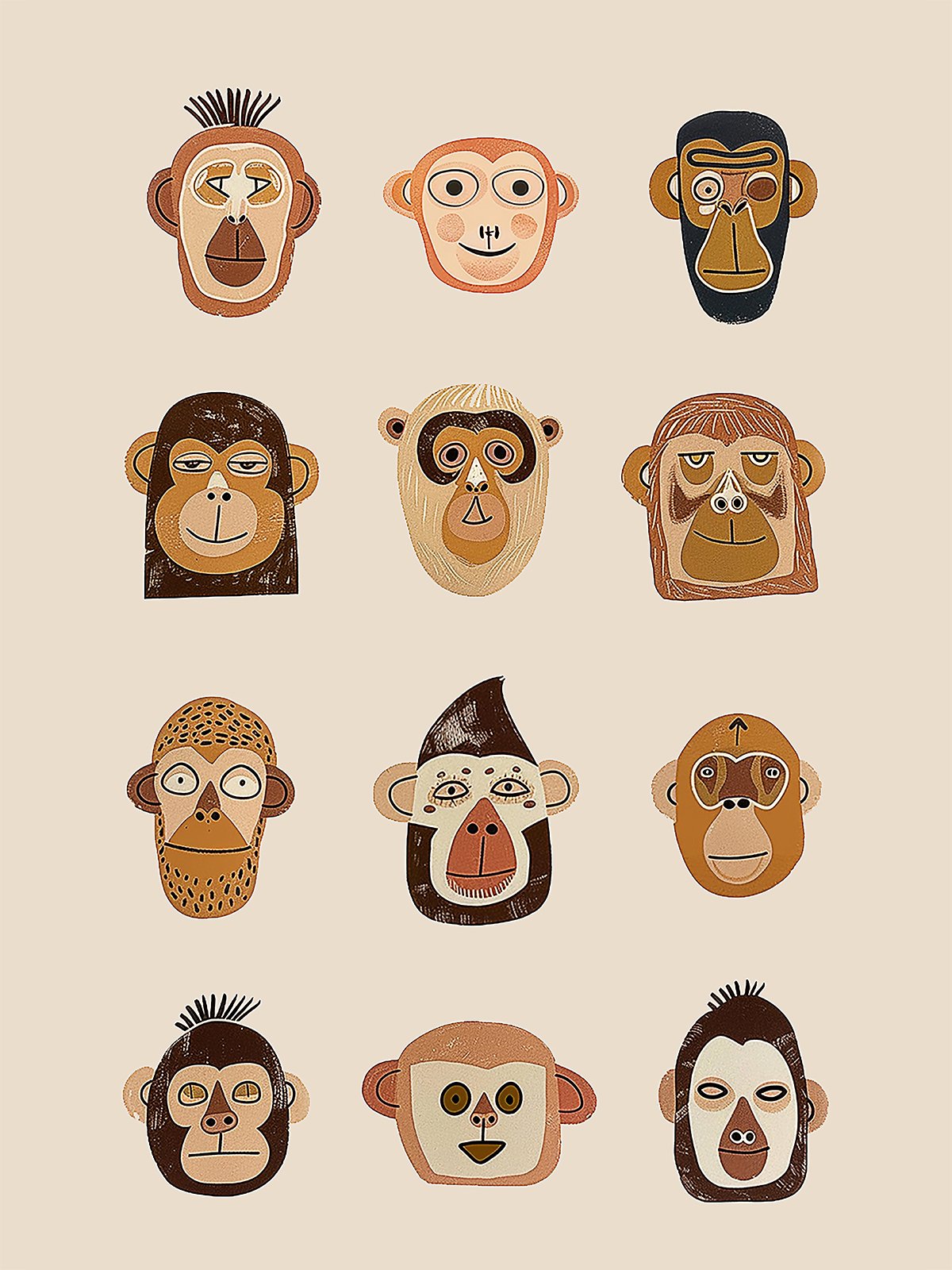 这幅插画风格的作品有十二张不同的猴脸,每张都有独特的表情和颜色,展现出各种情绪和个性。温暖的棕色色调给图像带来一种舒适和俏皮的感觉。每张脸都生动有趣,仿佛在讲述不同的故事,吸引观众探索其中的细节和创造力。