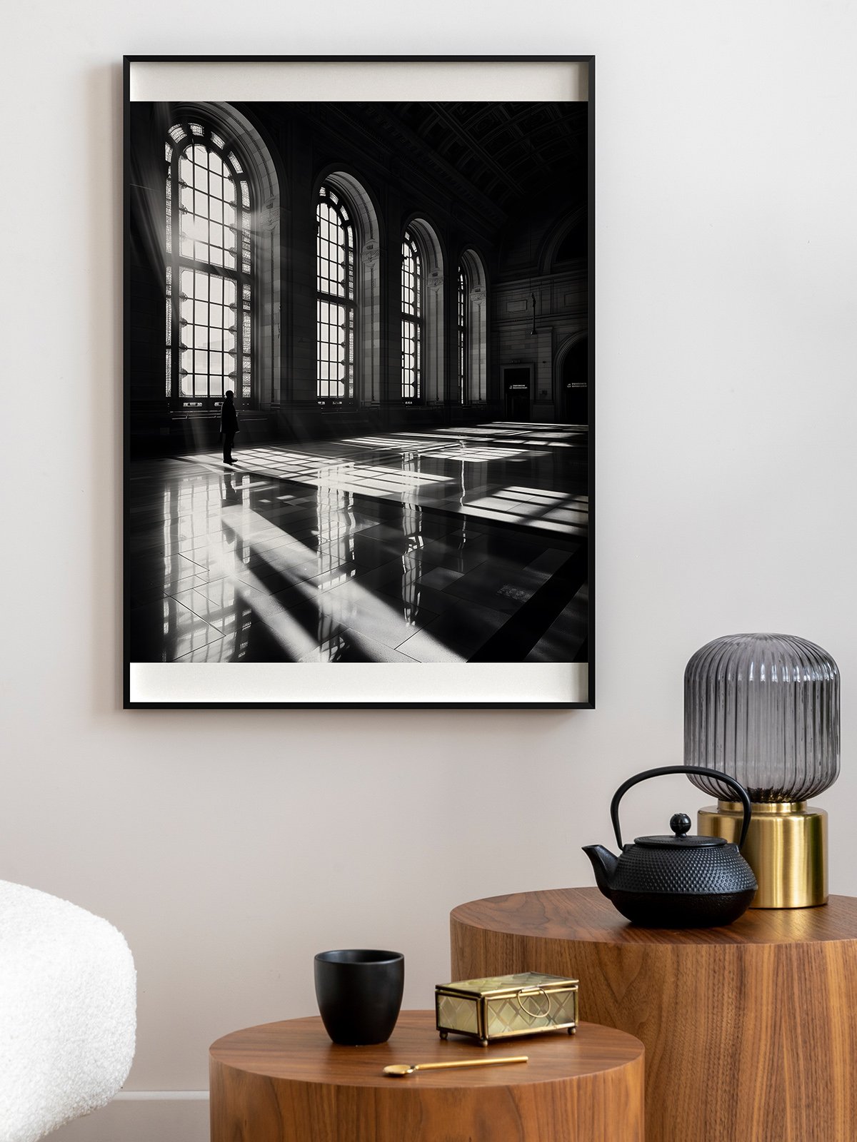 The black-and-white photo shows a spacious interior clad in marble, with arched windows dividing the space and letting in soft light. On the left, a person stands quietly from behind, seeming to be deep in thought. The whole scene is quiet and solemn, full of tranquility and profound atmosphere.