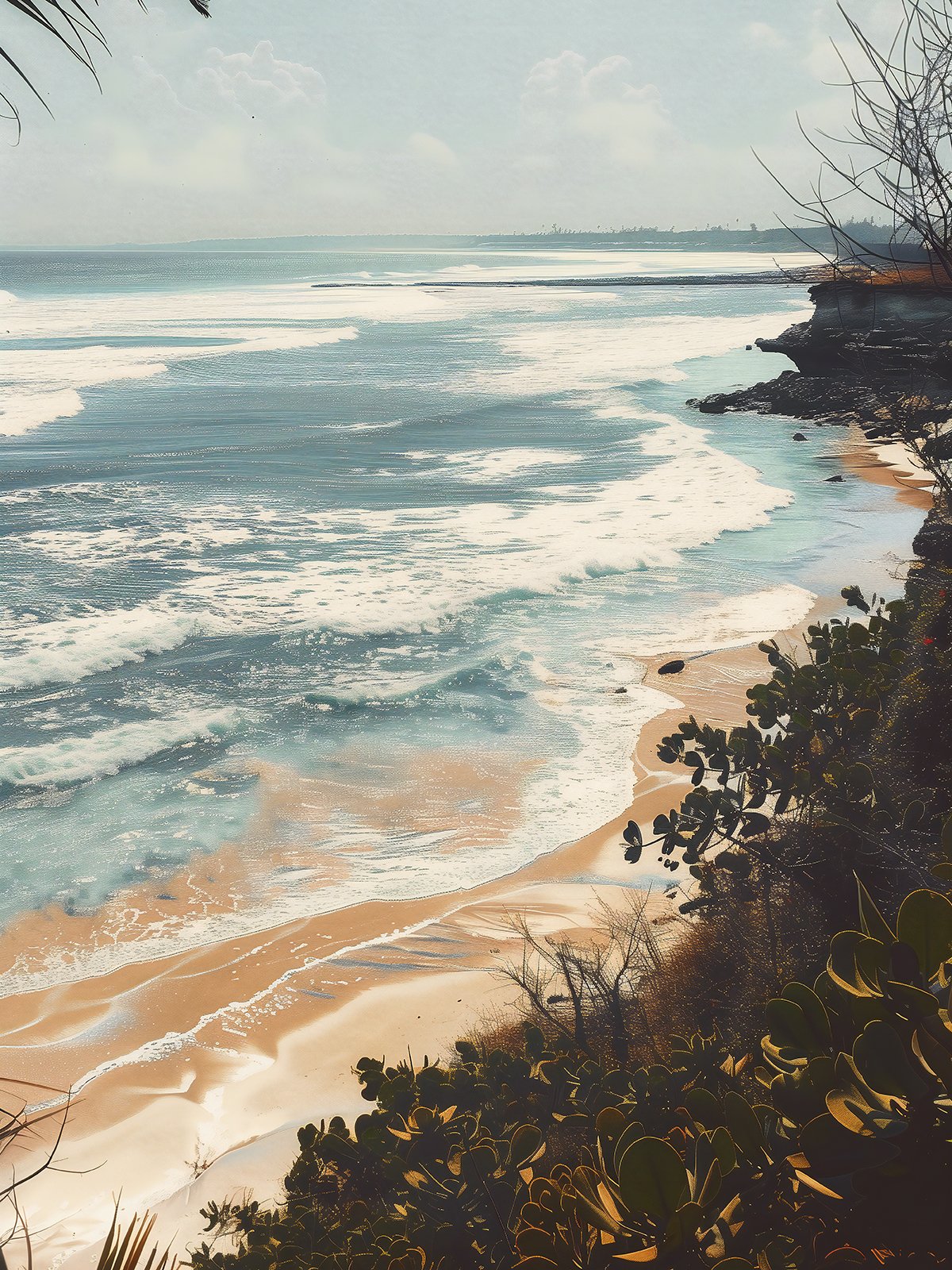 This photograph captures a beautiful morning seashore scene, with sunlight casting a glow on the waves and sandy beach. The seawater appears clear blue-green, and the waves gently lap the shore, creating a soothing sound. The foreground’s green vegetation adds depth to the image. The distant coastline fades into a light mist, giving the entire scene a tranquil and picturesque quality. The image exudes the harmony of nature, evoking the serenity and freshness of a seaside morning.