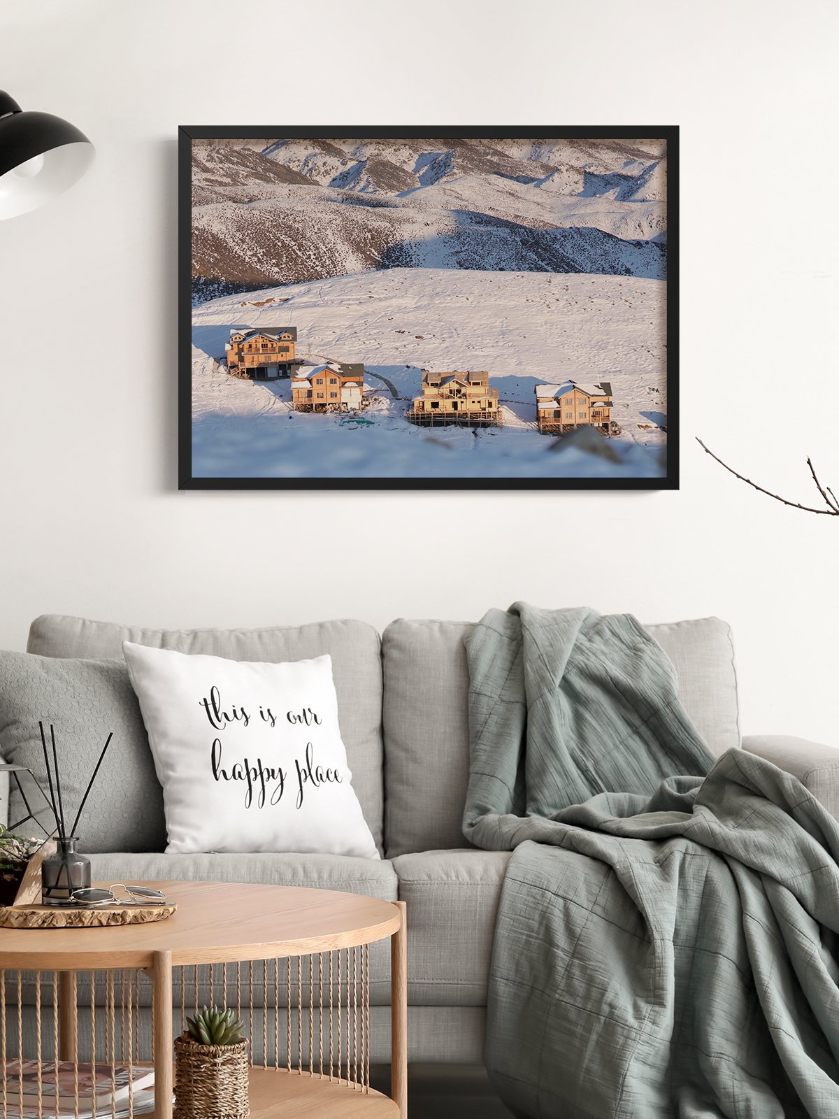 This image showcases several wooden cabins standing quietly on a snow-covered hillside, with rolling mountains in the background. The warm glow of the setting sun adds a touch of warmth and serenity to the scene. The image evokes a sense of seclusion, as if these cabins are tranquil retreats in the midst of nature.